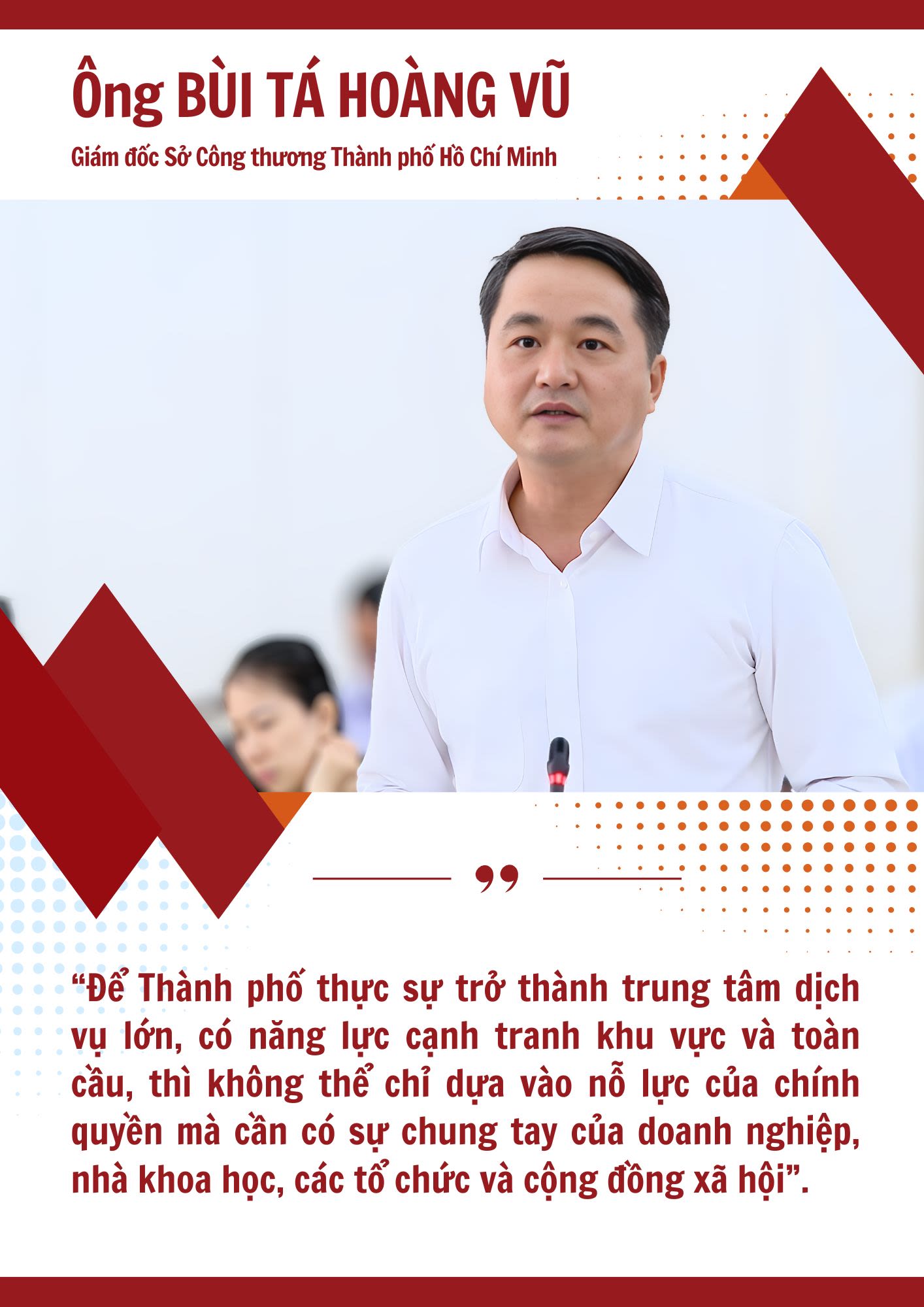 Sở Công thương Thành phố Hồ Chí Minh cho biết: Thành phố xác định yêu cầu cấp thiết là phải tái cấu trúc mạnh mẽ khu vực dịch vụ theo theo 4 hướng: Phát triển theo cả chiều rộng (liên kết vùng) lẫn chiều sâu (nâng cao chất lượng và giá trị gia tăng); ứng dụng công nghệ số và trí tuệ nhân tạo (AI) vào hoạt động cung ứng dịch vụ; thúc đẩy liên kết vùng và hợp tác quốc tế nhằm phát triển các thị trường dịch vụ mới; hình thành hệ sinh thái dịch vụ chất lượng cao với các trụ cột là tài chính, thương mại, logistics, công nghệ, giáo dục, y tế, du lịch và văn hóa sáng tạo.