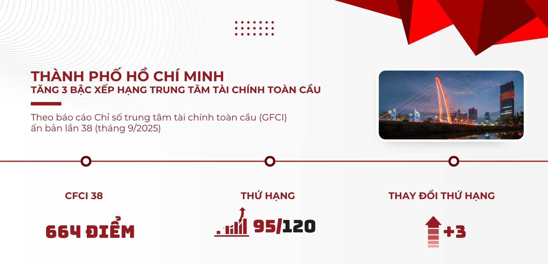 Tháng 9/2025, Chỉ số Trung tâm Tài chính toàn cầu lần thứ 38 (GFCI 38) công bố kết quả xếp hạng, trong đó Thành phố Hồ Chí Minh tăng ba bậc, đứng vị trí 95/120 thành phố trên toàn thế giới, vượt qua Bangkok (Thái Lan), đây là một bước tiến có ý nghĩa lớn. Điểm số của Thành phố tăng thêm 10 điểm (đạt 664 điểm), đồng thời được xếp vào nhóm “Trung tâm tài chính cần theo dõi”. So với năm 2024, Thành phố đã tăng tổng cộng 10 bậc, cho thấy niềm tin ngày càng lớn của cộng đồng tài chính quốc tế đối với tiềm năng phát triển của Việt Nam nói chung và Thành phố Hồ Chí Minh nói riêng.