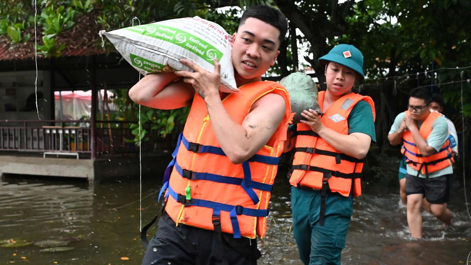 Dân quân hỗ trợ người dân Thanh Đa trong việc chống ngập.