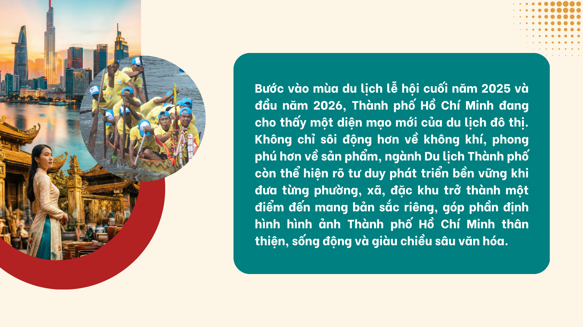 Theo Sở Du lịch Thành phố Hồ Chí Minh, ngành Du lịch Thành phố đã phối hợp cùng 168 phường, xã và đặc khu triển khai nhiều chương trình kích cầu, từng bước hình thành mạng lưới điểm đến nội vùng. Mỗi địa phương không còn là một không gian hành chính đơn thuần, mà được “kể câu chuyện riêng” thông qua các sản phẩm du lịch đặc trưng, gắn với lịch sử, văn hóa và đời sống cộng đồng.