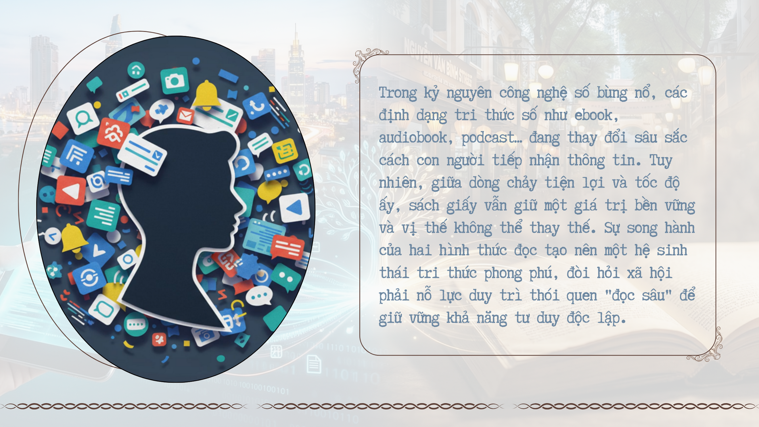 Trong dòng chảy mạnh mẽ của công nghệ, văn hóa đọc đang chuyển mình theo nhiều hướng mới mẻ, năng động và phong phú hơn. Nhưng dù phương tiện thay đổi, nhu cầu tiếp nhận tri thức sâu sắc và có chọn lọc của con người vẫn không đổi. Sách điện tử hay sách nói mang đến sự linh hoạt cần thiết cho nhịp sống hiện đại; còn sách giấy, bằng sự hiện diện hữu hình và khả năng kết nối cảm xúc, vẫn là điểm tựa của tư duy bền vững. Giữ gìn văn hóa đọc vì thế không phải là cuộc “chọn bên” giữa sách số và sách giấy, mà là hành trình tìm kiếm sự cân bằng: để công nghệ mở rộng cánh cửa tri thức, và để trang giấy giữ lại chiều sâu suy ngẫm.