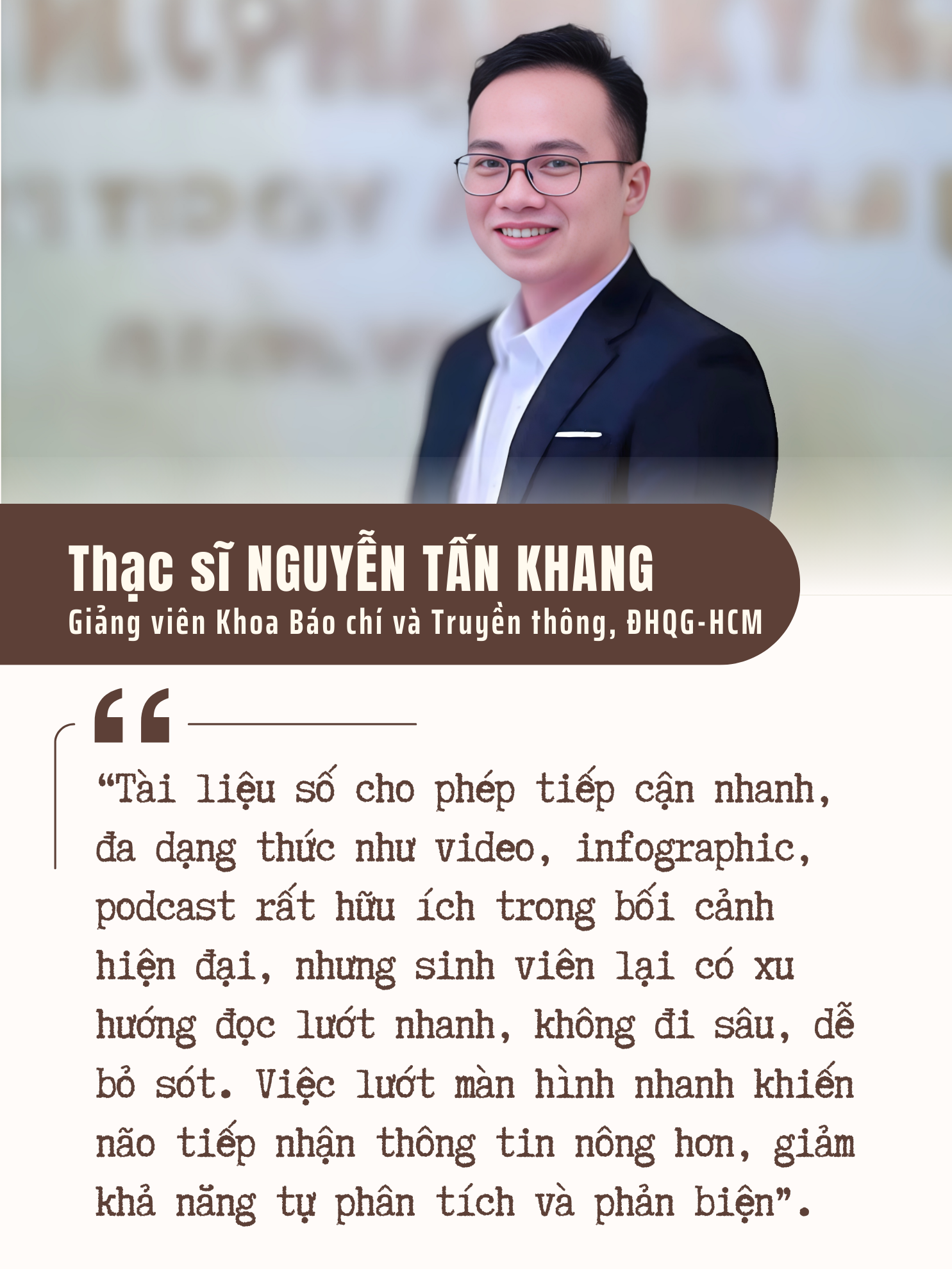 Tuy nhiên, mặt trái của sự tiện lợi, chính là sự thu hẹp của “đọc sâu”. Sự bùng nổ nội dung số không chỉ thay đổi phương tiện tiếp cận tri thức mà còn ảnh hưởng đến hành vi đọc. Khi thông tin đến quá nhanh, quá nhiều, người dùng dễ hình thành thói quen đọc lướt, tiếp nhận nông, phụ thuộc thuật toán gợi ý, khiến khả năng tập trung và phân tích bị suy giảm.