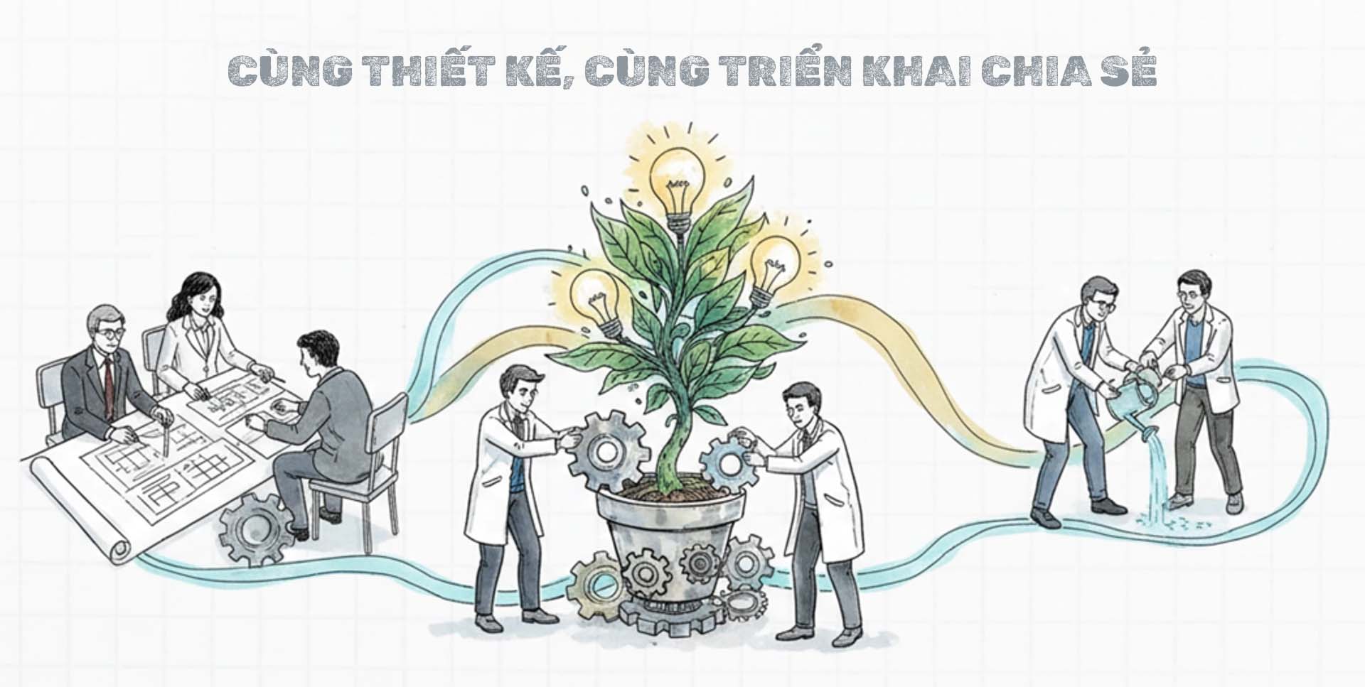Mô hình hợp tác “3 nhà” được Đại học quốc gia Thành phố Hồ Chí Minh xác định là tam giác chiến lược, cốt lõi trong hệ sinh thái quốc gia đổi mới sáng tạo. Ba bên vận hành theo nguyên tắc “cùng thiết kế-cùng triển khai-cùng chia sẻ giá trị”. Các bên cùng nhau tham gia xây dựng mục tiêu nghiên cứu, đồng thời chia sẻ lợi ích tài chính từ kết quả ứng dụng. Khi “tam giác chiến lược” vận hành hiệu quả, quốc gia sẽ có cơ hội “đi tắt, đón đầu”, thoát khỏi bẫy thu nhập trung bình và vươn lên mạnh mẽ.