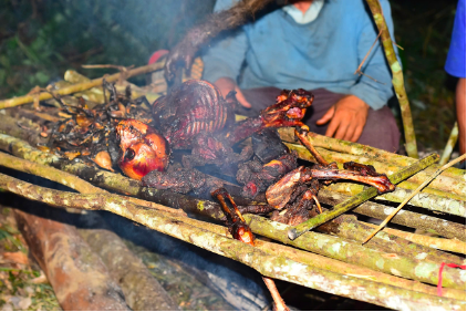 Thợ săn: Tôi không giết khỉ con. Bế nó về, cho nó đậu (đứng, bám) trên vai, trên balo của mình, mình gùi đi. Mình buộc sợi dây nhỏ vào cổ kẻo nó chạy mất. Cả đàn khỉ con. Còn khỉ bố mẹ thì con nào đã chết phải đem “ăn lòng” (nội tạng) luôn kẻo nó thối hỏng mất. Thịt khỉ thì phải đốt lửa, sấy khô để tránh ôi thiu. Con còn sống thì bỏ vào bao tải đem về. Thịt khỉ bán 150 nghìn đồng một ký (kg) - tương đương với giá bán thịt lợn trang trại ở ngoài chợ quê. Tui bắt được cầy hương là bán được giá nhất, mấy triệu đồng một cân. Con đực nó có hương thơm do có túi xạ ở trong “bụng”. Con cái thì không thơm.