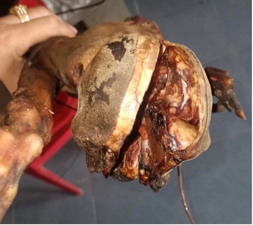 Có lần, chúng tôi vào một tiệm “bán đồ nhậu” ở miền trung, mấy loài linh trưởng được giới thiệu là khỉ, còn nguyên bộ xương ám khói, ít thịt còn bám ở “chân tay” thui vàng cháy xém lớp da. Những con vật tội nghiệp. Họ nhậu hết thịt nạc, gom giữ xương xẩu, bán cho người ta nấu cao. Nhưng than ôi, sọ con khỉ nào cũng bị bổ làm đôi. Chủ nhà bảo, bắn được, còn tươi, họ bổ hộp sọ khỉ ra, ăn óc sống, với suy nghĩ là nó chữa được nhiều thứ bệnh, như ảnh dưới đây.