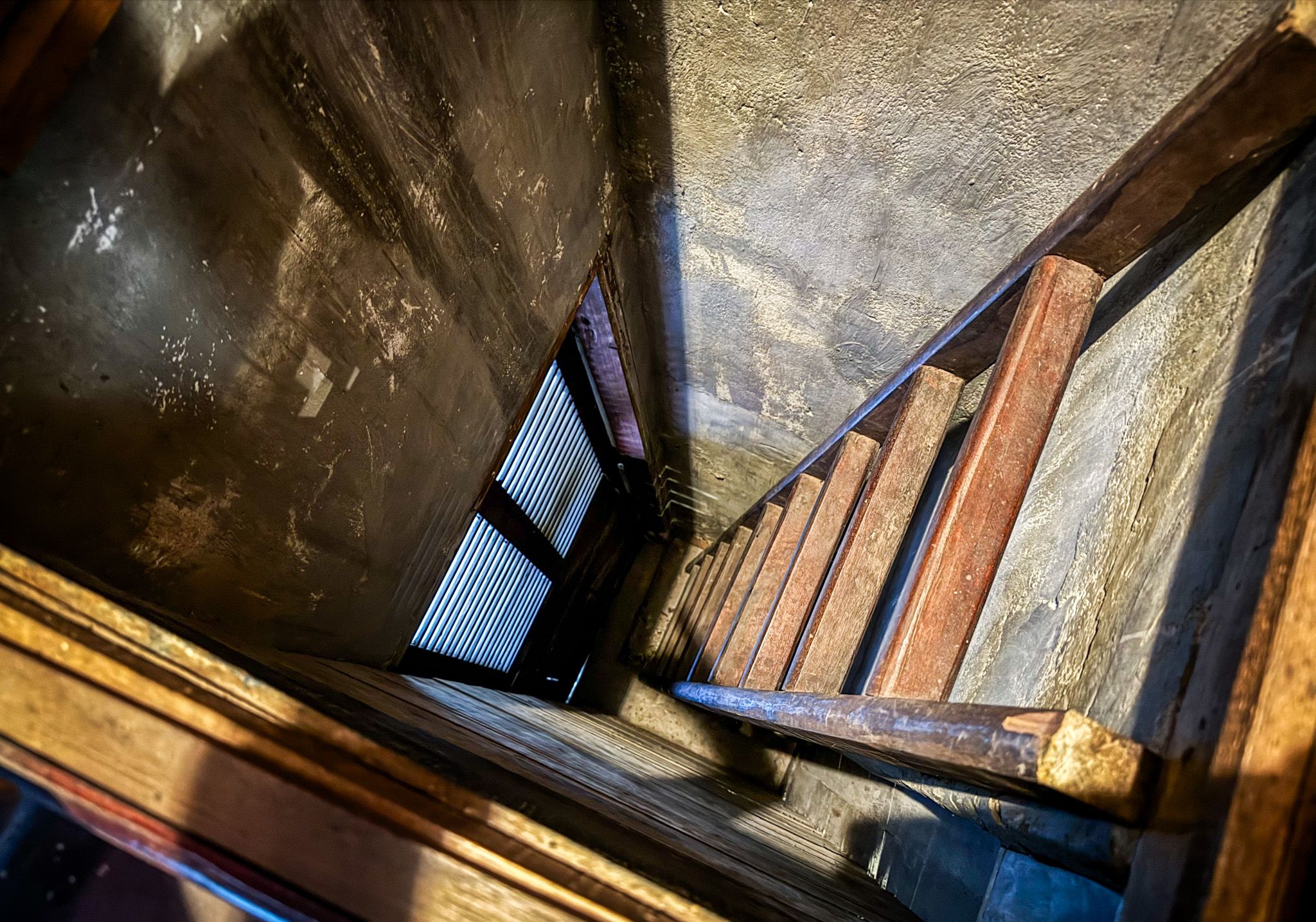 Không gian hoài cổ với cầu thang gỗ, và nền gạch trắng đỏ xen kẽ.