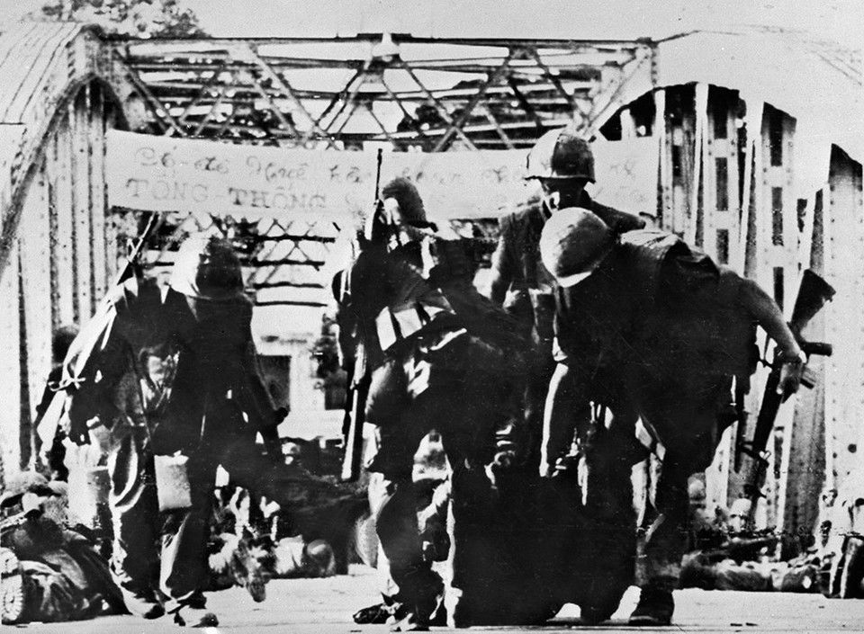 Chỉ trong 3 tiếng đồng hồ của đêm 30/1, rạng sáng 31/1 (đêm 1, rạng 2 Tết), quân Giải phóng tấn công và đánh chiếm hầu hết các mục tiêu ở thành phố Huế. Trong ảnh: Lính Mỹ khiêng xác đồng bọn rút chạy qua cầu Tràng Tiền, sáng 31/1. (Ảnh: Tư liệu/TTXVN phát)