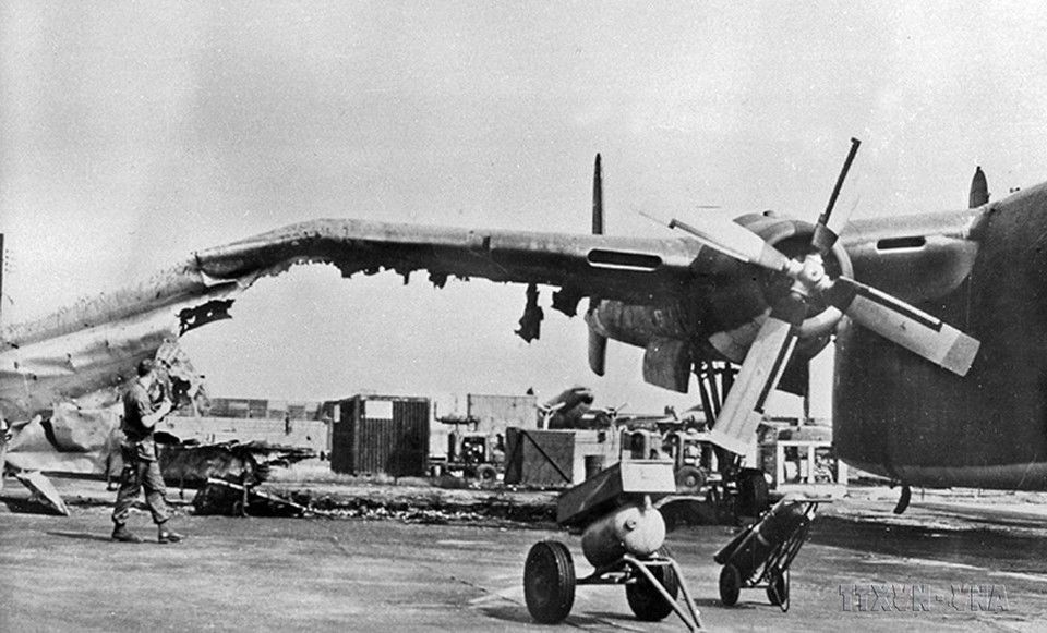 Máy bay vận tải C.119 của Mỹ bị quân Giải phóng phá hủy trong trận đánh vào sân bay Tân Sơn Nhất, đêm 30/1 rạng ngày 31/1. (Ảnh: Tư liệu Thông tấn xã Giải phóng)