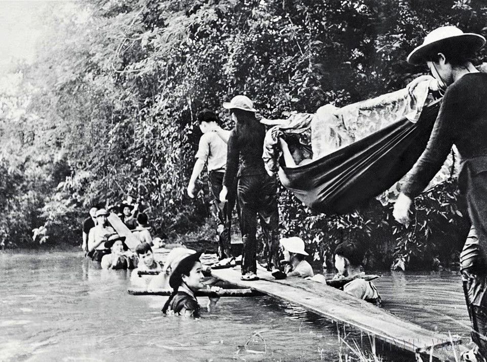 Bức ảnh “Cầu người” của phóng viên TTXVN Phạm Văn Thính ghi lại sinh động hình ảnh những thanh niên xung phong ngâm mình dưới nước làm trụ để đỡ các tấm ván, tạo thành chiếc cầu để chuyển thương binh qua suối Nhum, thuộc Chiến khu D, huyện Dương Minh Châu, tỉnh Tây Ninh, trong cuộc Tổng tiến công và nổi dậy Xuân Mậu Thân 1968. (Ảnh: Phạm Văn Thính/TTXVN)
