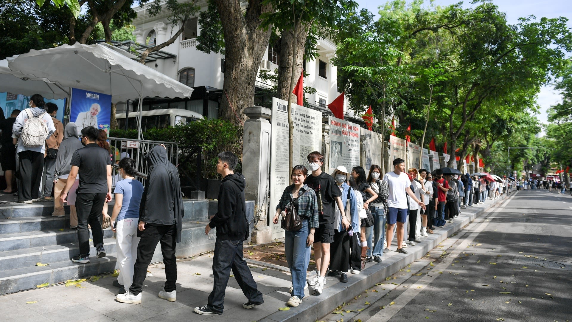 Độc giả xếp hàng tham quan triển lãm ảnh, nhận ấn phẩm đặc biệt kỷ niệm 135 năm Ngày sinh Chủ tịch Hồ Chí Minh tại Báo Nhân Dân.