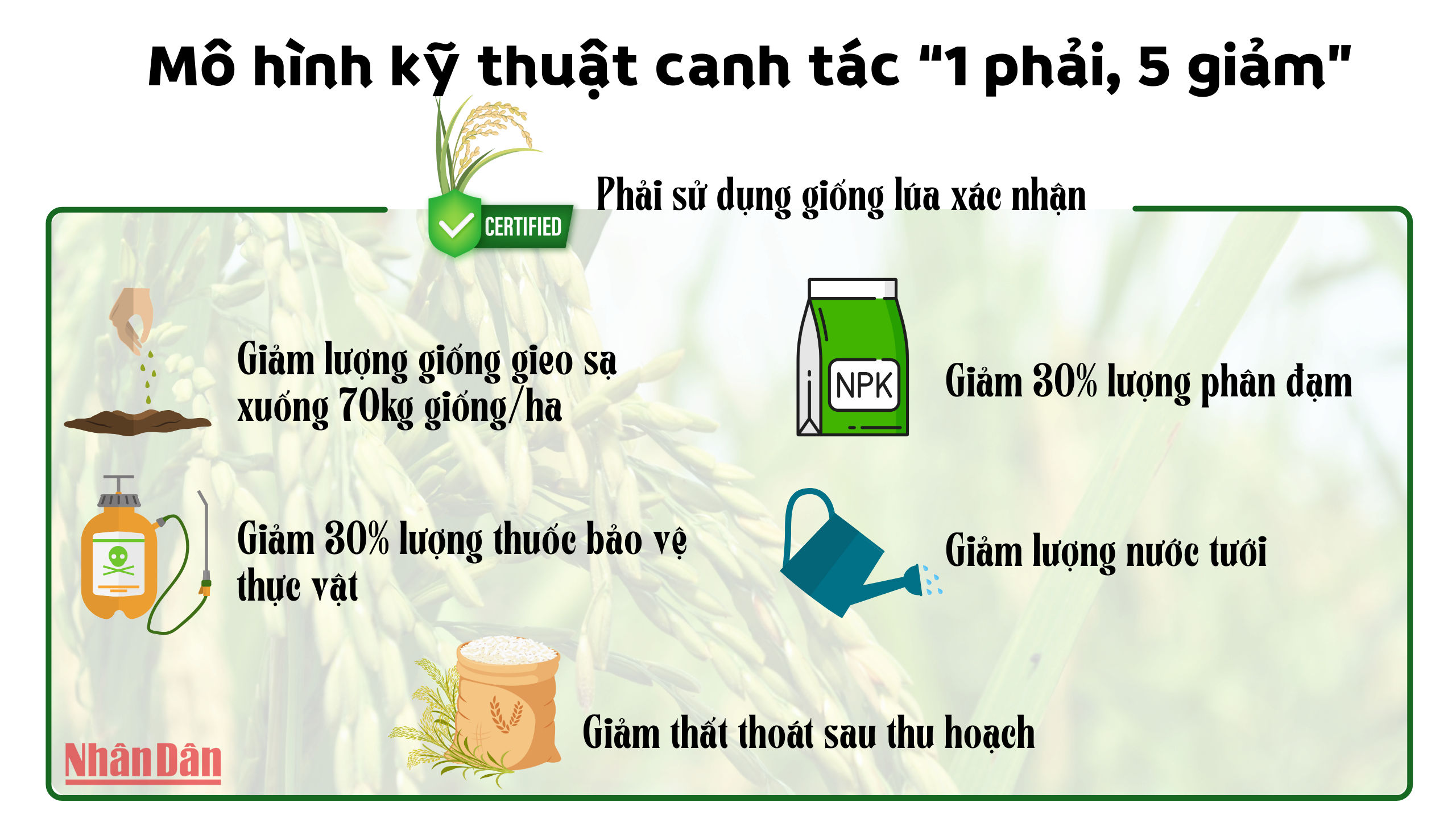 Nội dung nổi bật của đề án là “1 phải, 5 giảm”, là một mô hình kỹ thuật canh tác được Bộ Nông nghiệp và Phát triển nông thôn khuyến khích áp dụng. Theo đó, người nông dân “phải” sử dụng giống lúa xác nhận để bảo đảm chất lượng và năng suất ổn định.