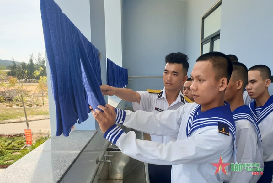 Tạ Nguyên Quang và các chiến sĩ mới học cách phơi khăn và gấp chăn, màn đúng quy định. (Ảnh: Báo Quân đội nhân dân)