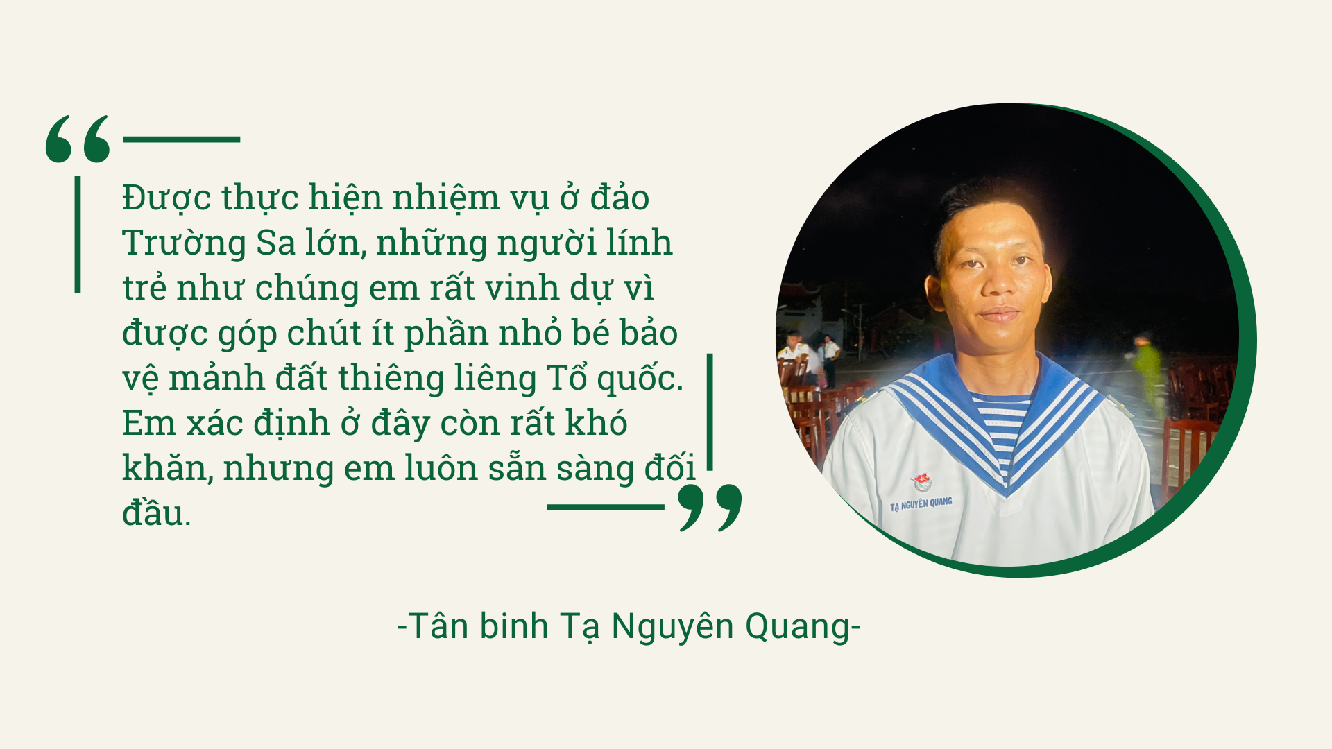 Thầy giáo trẻ Tạ Nguyên Quang đã trở nên rắn rỏi, rám nắng sau gần 1 năm gia nhập quân ngũ, làm tân binh tại đảo Trường Sa lớn. Mộc mạc, chân thành, Quang bảo, quyết định tạm dừng sự nghiệp công chức ngành giáo dục của mình để đi nghĩa vụ là một quyết định đúng đắn nhất với tuổi trẻ của em. "Em thấy mình trưởng thành hơn nhiều", Quang cười hiền khô.