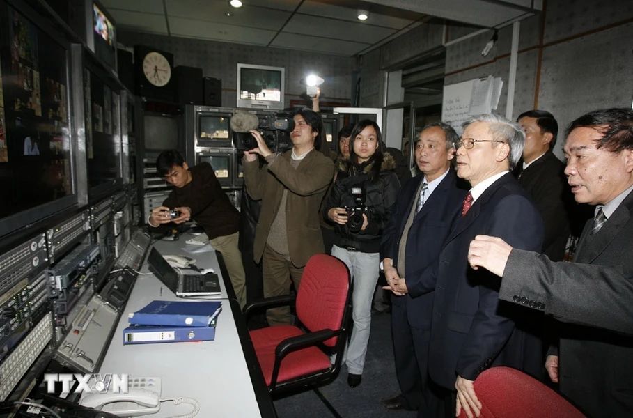Chủ tịch Quốc hội Nguyễn Phú Trọng thăm Trung tâm kỹ thuật sản xuất chương trình, Đài Truyền hình Việt Nam (Hà Nội, 6/2/2008).
