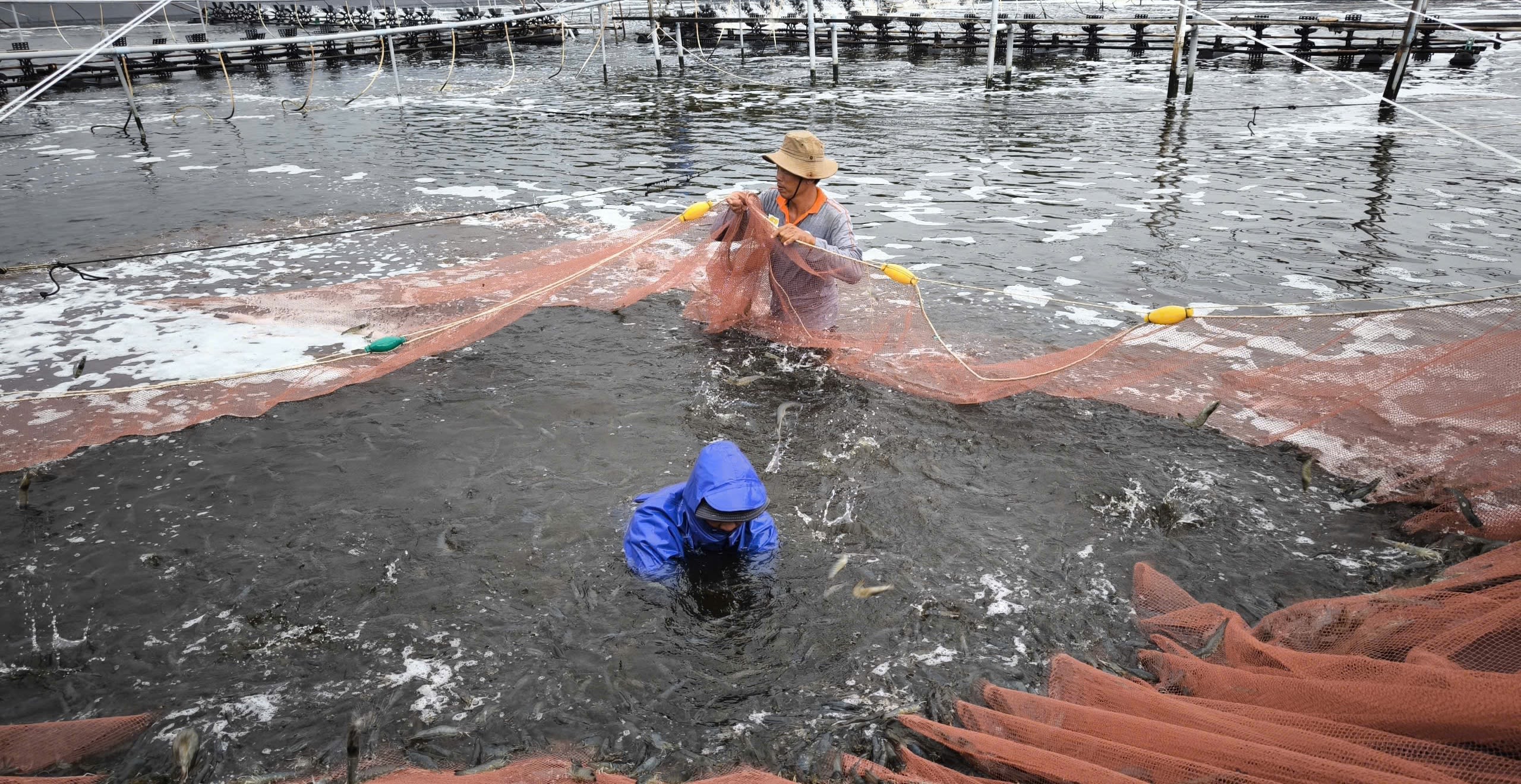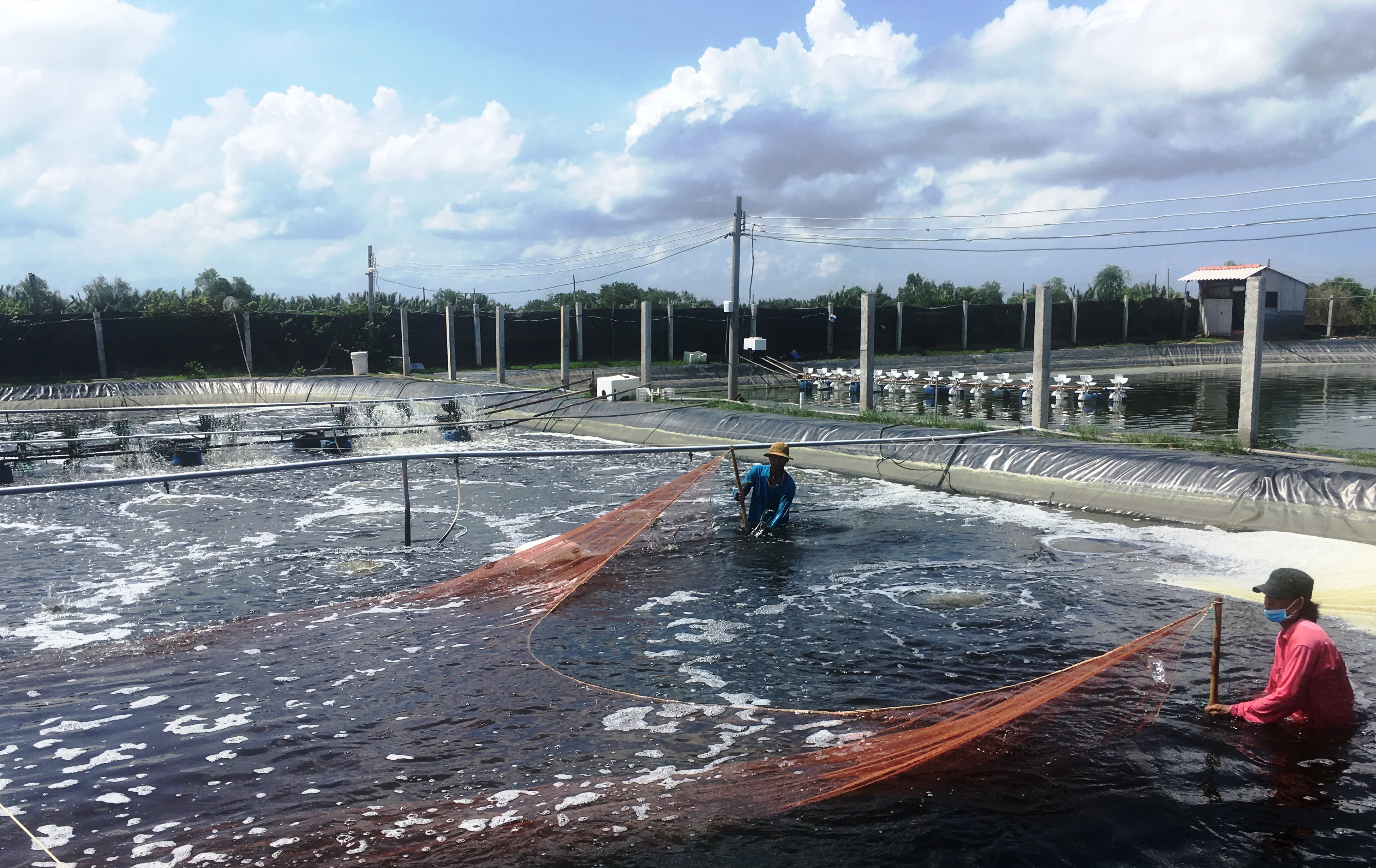 Thu hoạch tôm nuôi ứng dụng công nghệ cao hiệu quả tại tỉnh Bến Tre.