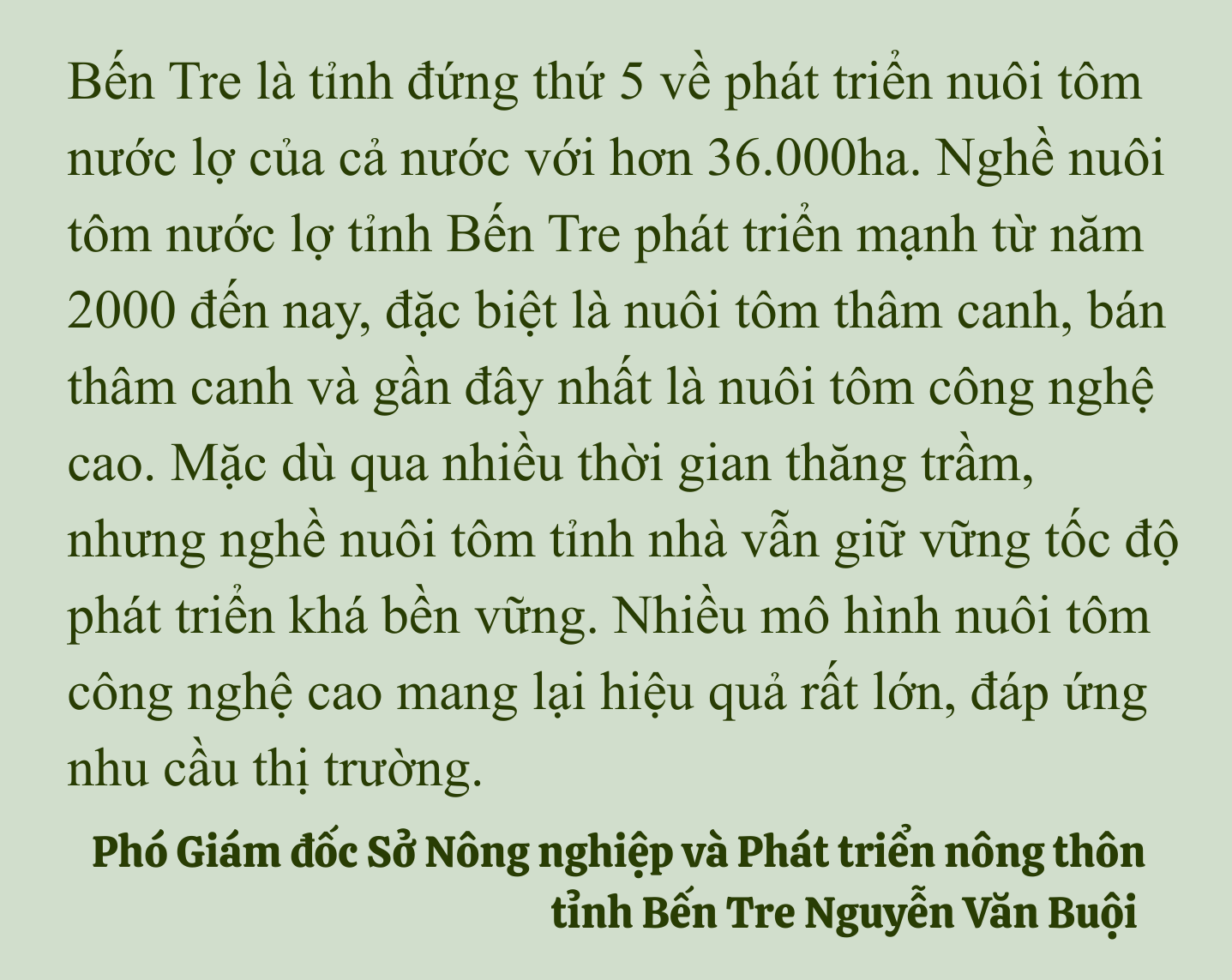 Phó Giám đốc Sở Nông nghiệp và Phát triển nông thôn tỉnh Bến Tre Nguyễn Văn Buội cho biết: “Bến Tre là tỉnh đứng thứ 5 về phát triển nuôi tôm nước lợ của cả nước với hơn 36.000ha. Nghề nuôi tôm nước lợ tỉnh Bến Tre phát triển mạnh từ năm 2000 đến nay, đặc biệt là nuôi tôm thâm canh, bán thâm canh và gần đây nhất là nuôi tôm công nghệ cao. Mặc dù qua nhiều thời gian thăng trầm, nhưng nghề nuôi tôm tỉnh nhà vẫn giữ vững tốc độ phát triển khá bền vững. Nhiều mô hình nuôi tôm công nghệ cao mang lại hiệu quả rất lớn, đáp ứng nhu cầu thị trường”.