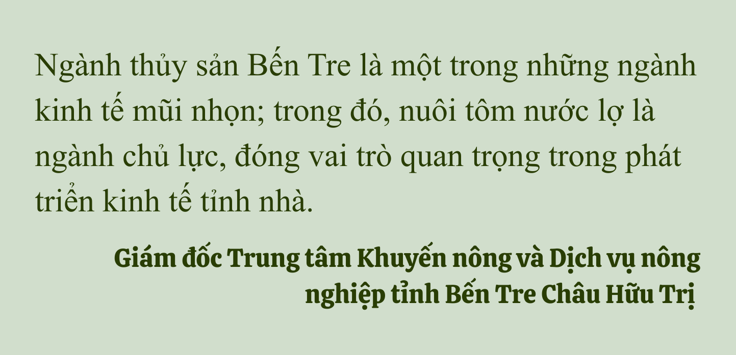 Giám đốc Trung tâm Khuyến nông và Dịch vụ nông nghiệp tỉnh Bến Tre Châu Hữu Trị cho biết: “Ngành thủy sản Bến Tre là một trong những ngành kinh tế mũi nhọn; trong đó, nuôi tôm nước lợ là ngành chủ lực, đóng vai trò quan trọng trong phát triển kinh tế tỉnh nhà.