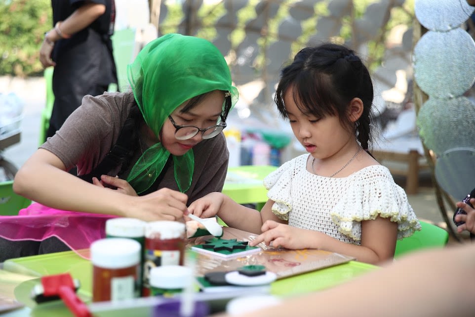 “Cả nhà chơi cùng nhau đã vui rồi, được chơi miễn phí lại càng khoái chí”, chị Nguyễn Thị Hương Ly (36 tuổi, quận Hoàng Mai) dắt con 4 tuổi lên chơi. Bé nhà chị thích nhất việc in dập họa tiết gạch bông lên giấy và ghép gạch mosaic nên chỉ quanh quần ở Xưởng in dấu tháng năm với Xưởng ghép gạch.