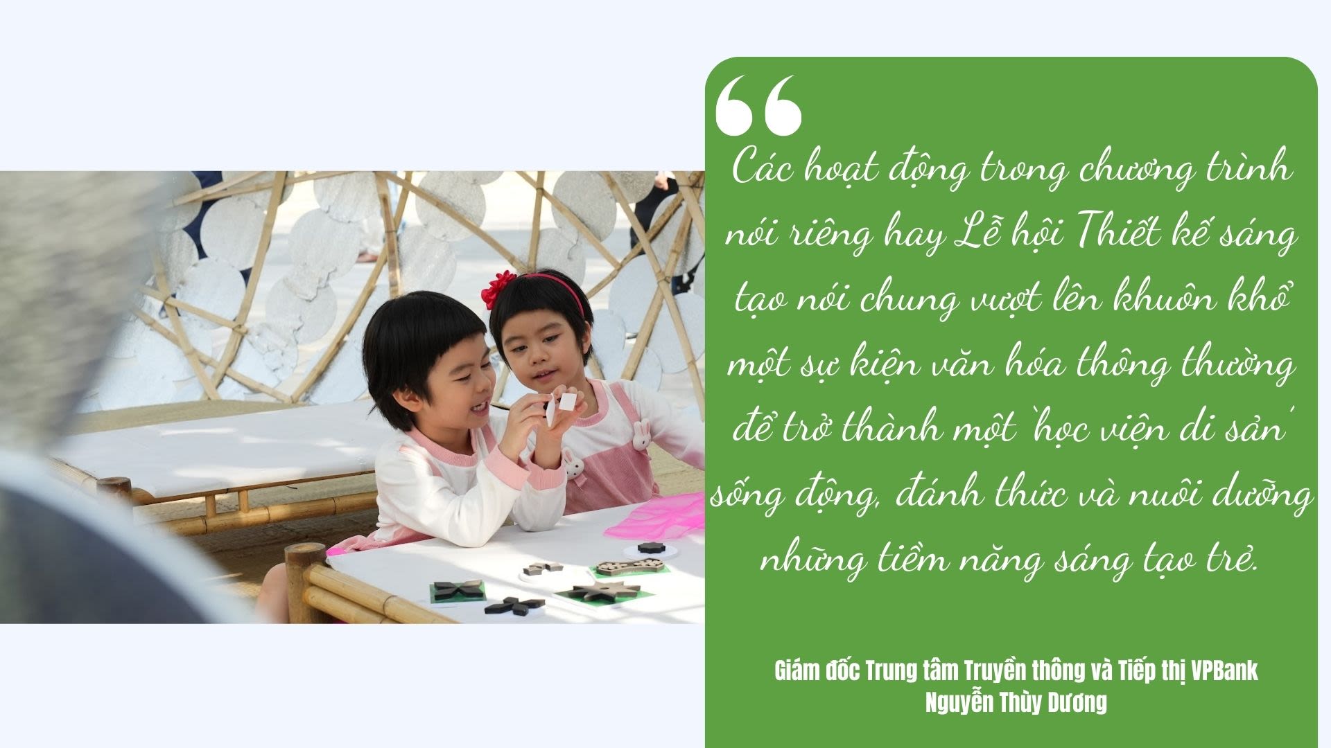 Nói như bà Nguyễn Thùy Dương, giám đốc Trung tâm Truyền thông và Tiếp thị VPBank, “các hoạt động trong chương trình nói riêng hay Lễ hội Thiết kế sáng tạo nói chung vượt lên khuôn khổ một sự kiện văn hóa thông thường để trở thành một ‘học viện di sản’ sống động, đánh thức và nuôi dưỡng những tiềm năng sáng tạo trẻ”.