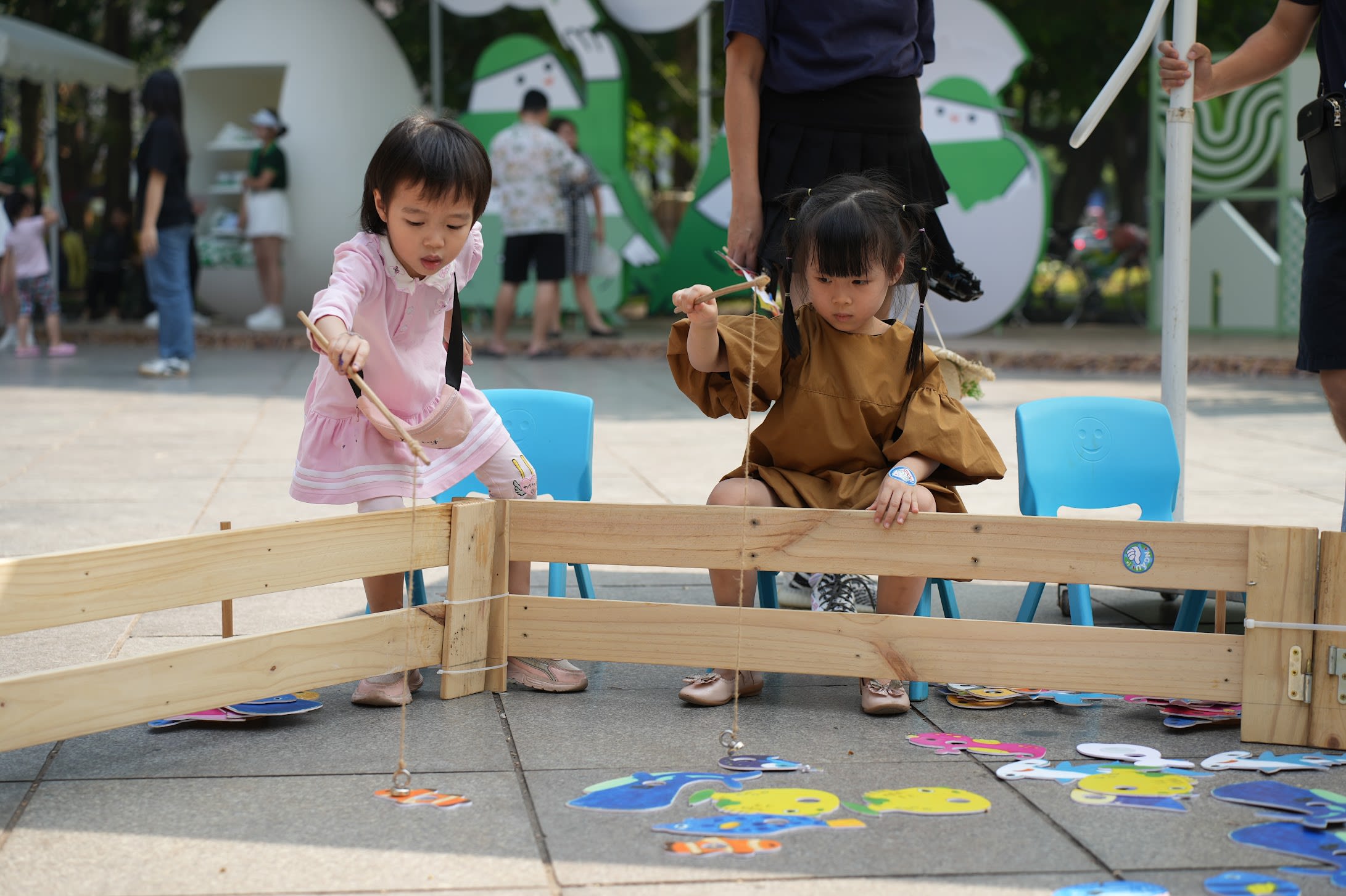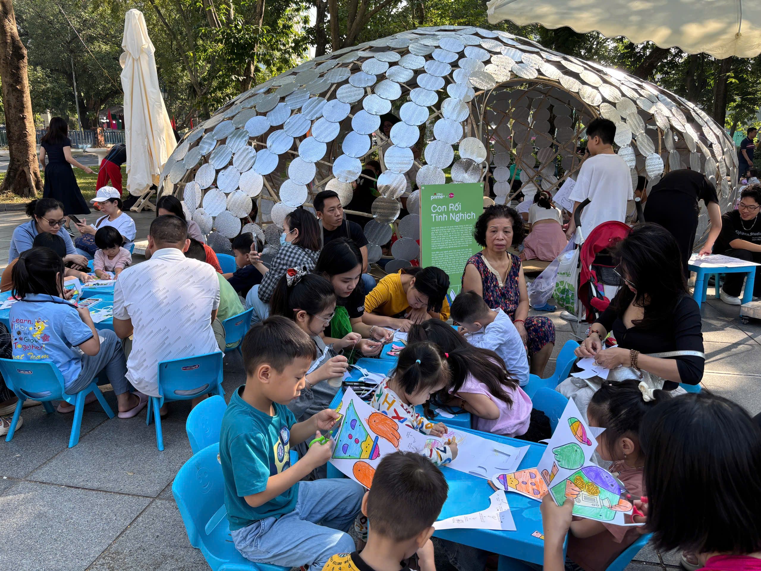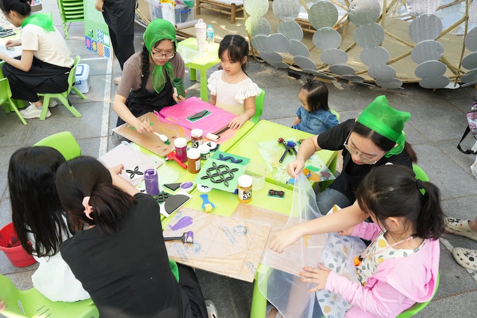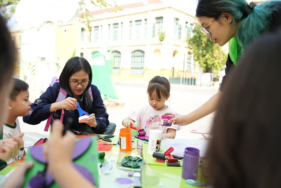 Dịp cuối tuần, không gian “ Giao lộ ký ức” VPBank x Tòhe, đón số lượng các gia đình đưa con về đây tham gia các hoạt động trải nghiệm ở Nhà chiếu phim ký ức, Xưởng in dấu tháng năm, Xưởng ghép gạch và Xưởng rối ngày càng đông.