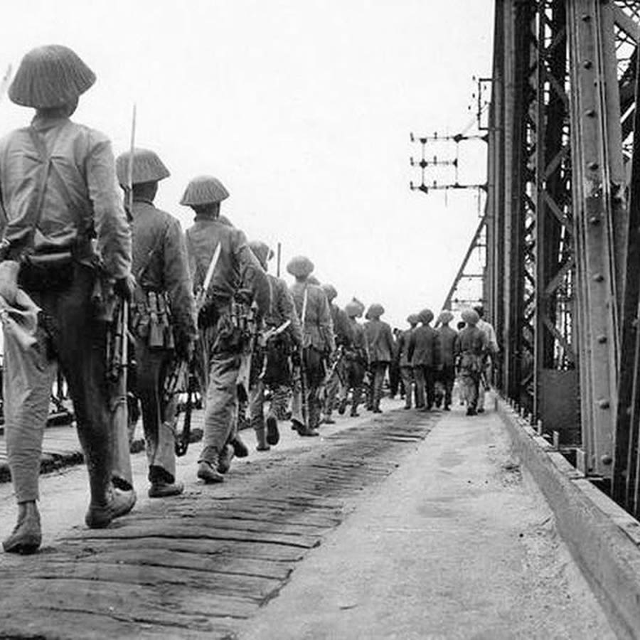 Chiều 9/10/1954, một đơn vị bộ đội ta hùng dũng tiến qua cầu Long Biên vào tiếp quản Hà Nội, cùng lúc quân Pháp rút khỏi Hà Nội qua cây cầu này phía chiều bên kia. Ảnh: TTXVN