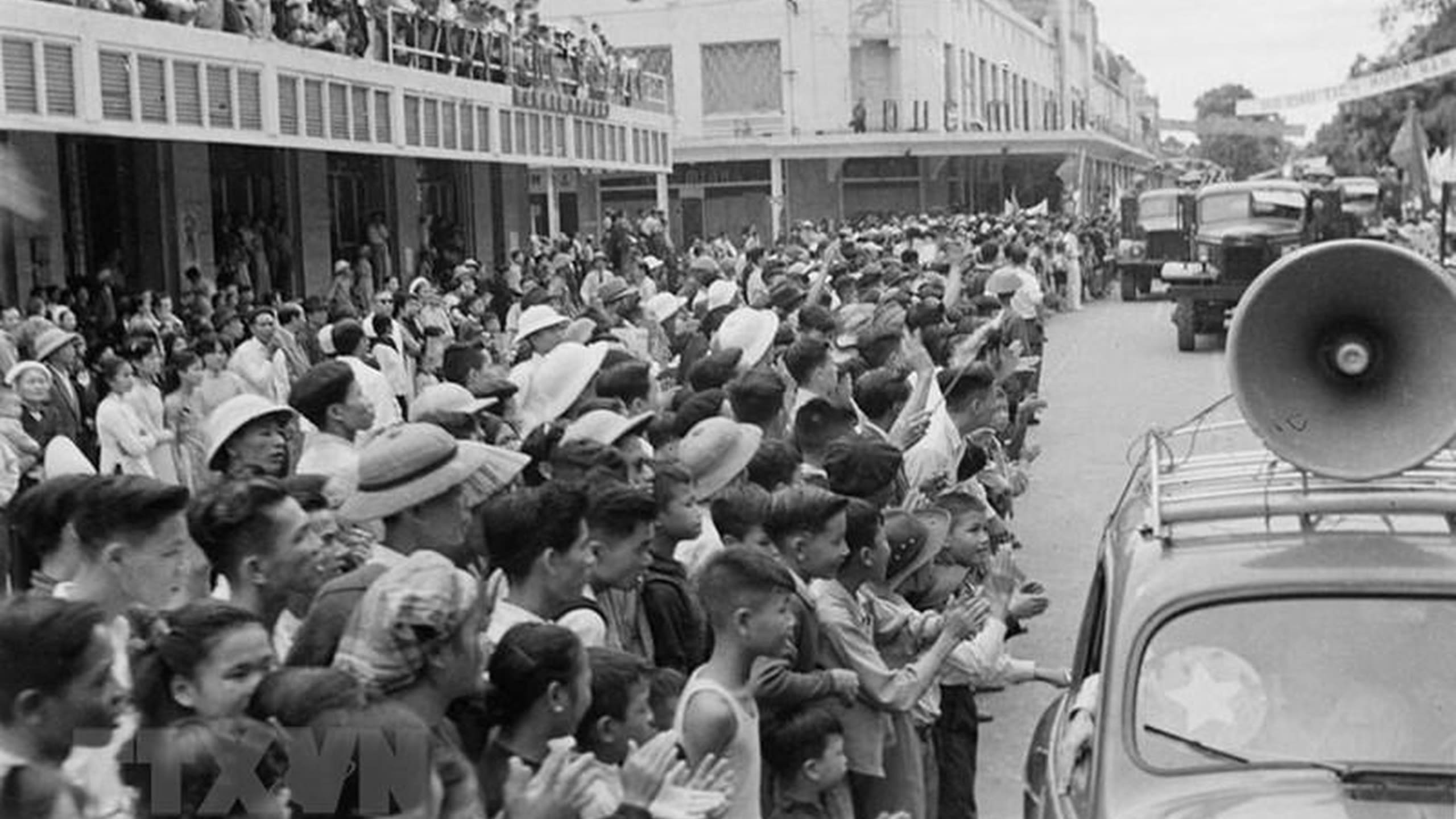 Hàng vạn người dân Hà Nội tràn ra đường chào đón đoàn quân chiến thắng về giải phóng Thủ đô. Ảnh: TTXVN