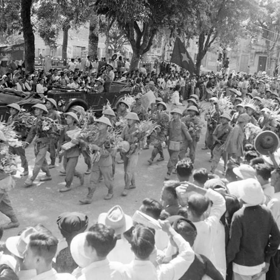 Cánh quân phía nam, thuộc hai Trung đoàn 88 và 36 của Đại đoàn 308 tiến qua phố Bạch Mai, phố Huế… vào tiếp quản Thủ đô, sáng 10/10/1954. Ảnh: TTXVN