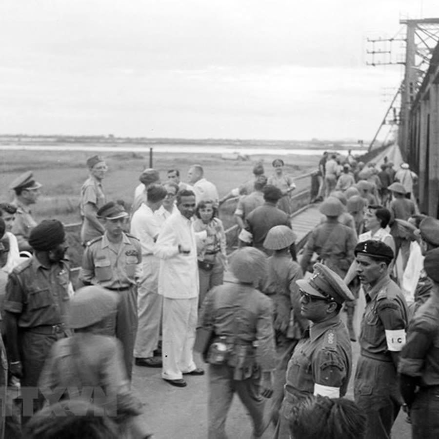 Bộ đội ta qua cầu Long Biên vào tiếp quản Hà Nội trước sự chứng kiến của đoàn Ủy ban quốc tế thi hành Hiệp định Geneva và quan sát viên quốc tế chiều 9/10/1954. Ảnh: TTXVN