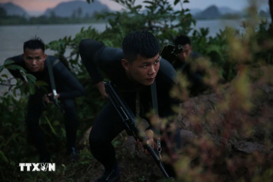 Chiến sỹ Lữ đoàn Đặc công Hải quân 126 đột nhập theo đường sông đánh chiếm mục tiêu giả định trong điều kiện đêm tối.