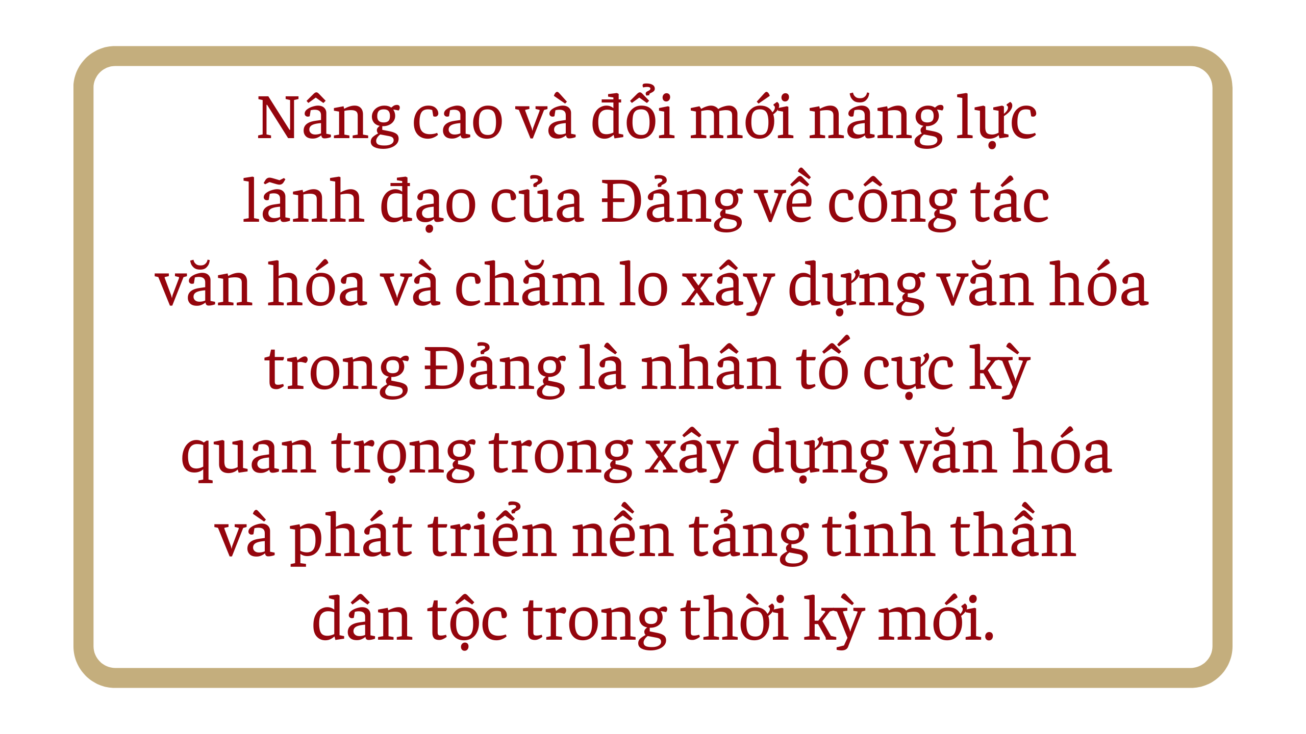 - Nền tảng tinh thần của xã hội Việt Nam hôm nay không ngừng được bồi đắp bởi sự phát triển văn hóa trong Ðảng, sự khẳng định vai trò dẫn dắt văn hóa của chính đảng giai cấp công nhân. Nhiệm vụ xây dựng chỉnh đốn Ðảng, nâng cao phẩm chất tốt đẹp và tính gương mẫu của cán bộ đảng viên có ý nghĩa ngày càng to lớn đối với sự phát triển văn hóa dân tộc.