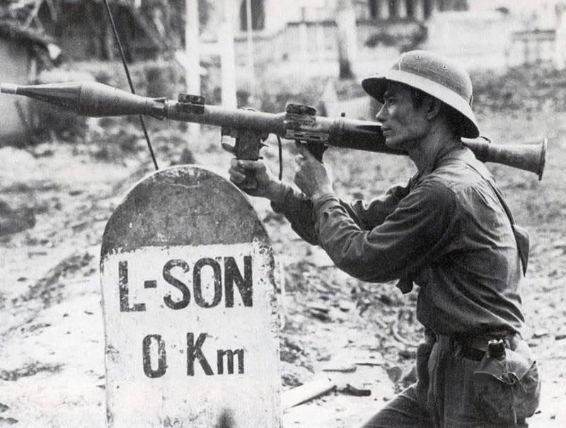 Hình ảnh người chiến sĩ cầm súng B41 hướng về phía quân xâm lược, bên cạnh là cột mốc số 0 Lạng Sơn, rạng sáng 17/2/1979 mang tính biểu tượng về cuộc chiến đấu bảo vệ biên giới phía bắc năm 1979. (Ảnh: Tư liệu/TTXVN)