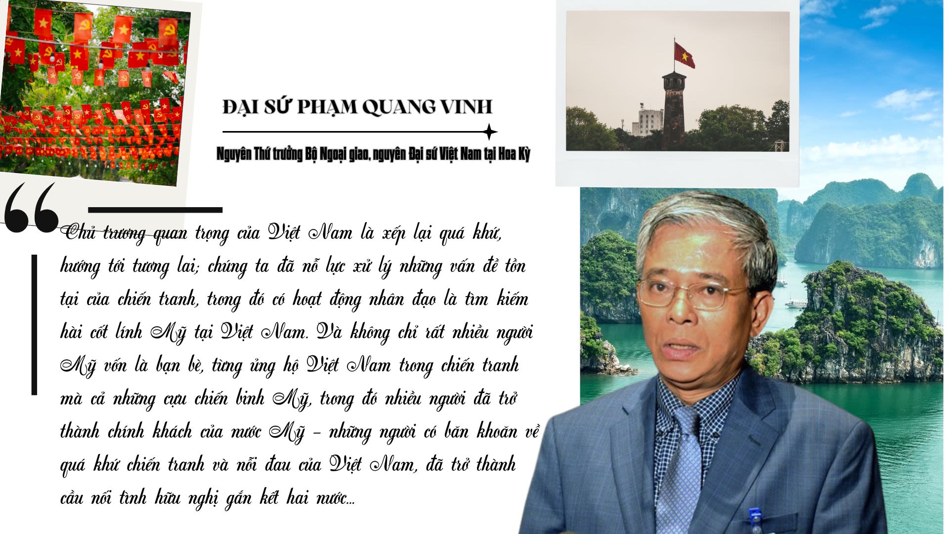 Đại sứ Phạm Quang Vinh - nguyên Thứ trưởng Bộ Ngoại giao, nguyên Đại sứ Việt Nam tại Hoa Kỳ nhìn nhận: Nhìn lại 50 năm qua, quan hệ Việt-Mỹ từng có chiến tranh gây bao đau thương cho nhân dân Việt Nam và cả nỗi đau ngay trong lòng nước Mỹ, để vượt qua hậu quả chiến tranh không phải là câu chuyện dễ dàng.