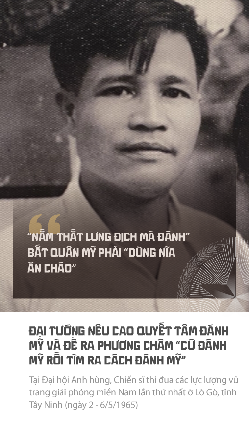 Từ thực tiễn chiến đấu phong phú của các đơn vị và địa phương trên toàn Miền, với tư duy biện chứng, sắc sảo, Đại tướng đã tổng kết thành phương châm, nghệ thuật tác chiến đặc sắc của Quân đội nhân dân Việt Nam, đồng thời là khẩu hiệu cách mạng nổi tiếng “Nắm thắt lưng địch mà đánh”. Từ các phương thức “ở gần đánh gần”, “căng địch ra mà đánh”, “đánh Mỹ ngay tại căn cứ của chúng”… đã xuất hiện hàng loạt “Vành đai diệt Mỹ” áp sát các căn cứ quân sự Mỹ trên khắp các chiến trường, như: Hòa Vang, Chu Lai (Quân khu 5), An Khê, Pleiku (Tây Nguyên), Củ Chi, Bến Cát (Đông Nam Bộ)… thực hiện vây hãm, tiêu hao, tiêu diệt quân Mỹ.