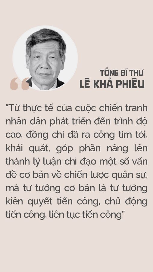 Từ thực tế của cuộc chiến tranh nhân dân phát triển đến trình độ cao, đồng chí đã ra công tìm tòi, khái quát, góp phần nâng lên thành lý luận chỉ đạo một số vấn đề cơ bản về chiến lược quân sự, mà tư tưởng cơ bản là tư tưởng kiên quyết tiến công, chủ động tiến công, liên tục tiến công.