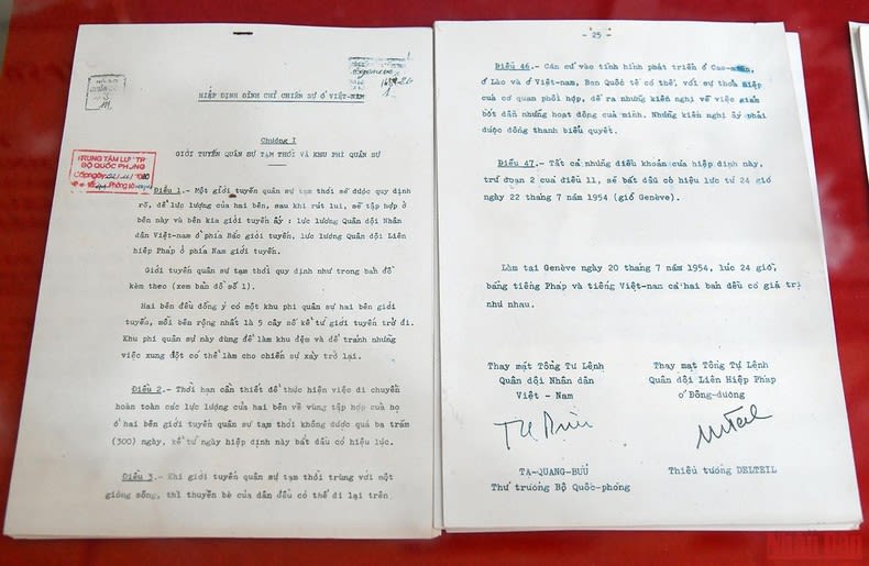Hiệp định đình chỉ chiến sự ở Việt Nam có chữ ký của Thứ trưởng Bộ Quốc phòng nước Việt Nam Dân chủ Cộng hòa Tạ Quang Bửu và Thiếu tướng Delteil, quân đội Liên hiệp Pháp tại Đông Dương. (Ảnh: Tư liệu Bảo tàng đôi bờ Hiền Lương-Bến Hải)