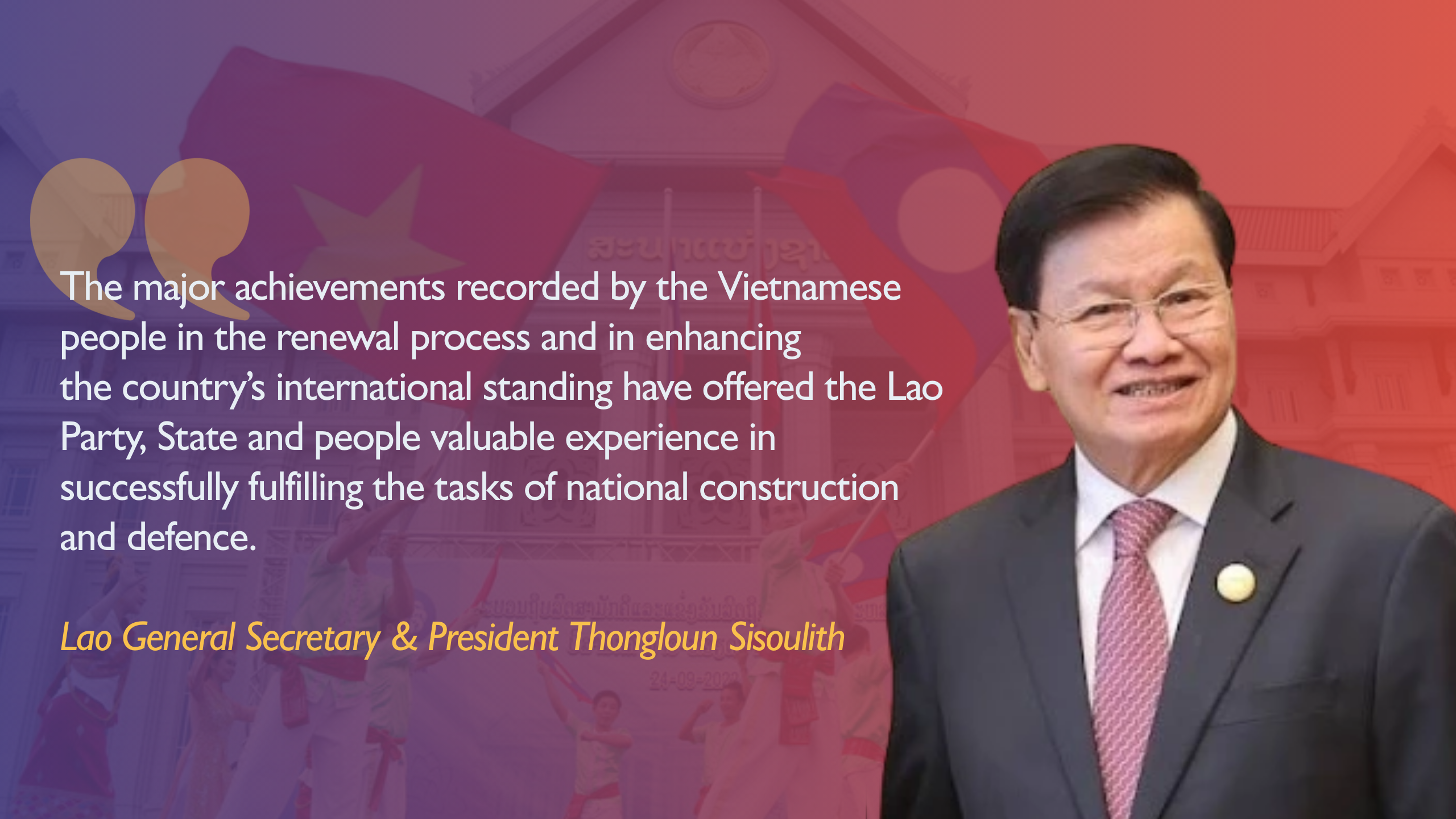 General Secretary To Lam emphasised that Viet Nam always highly values the major achievements Laos has gained over 50 years of national construction and 40 years of renewal, and deeply appreciates the significant contributions of former leaders through different periods.