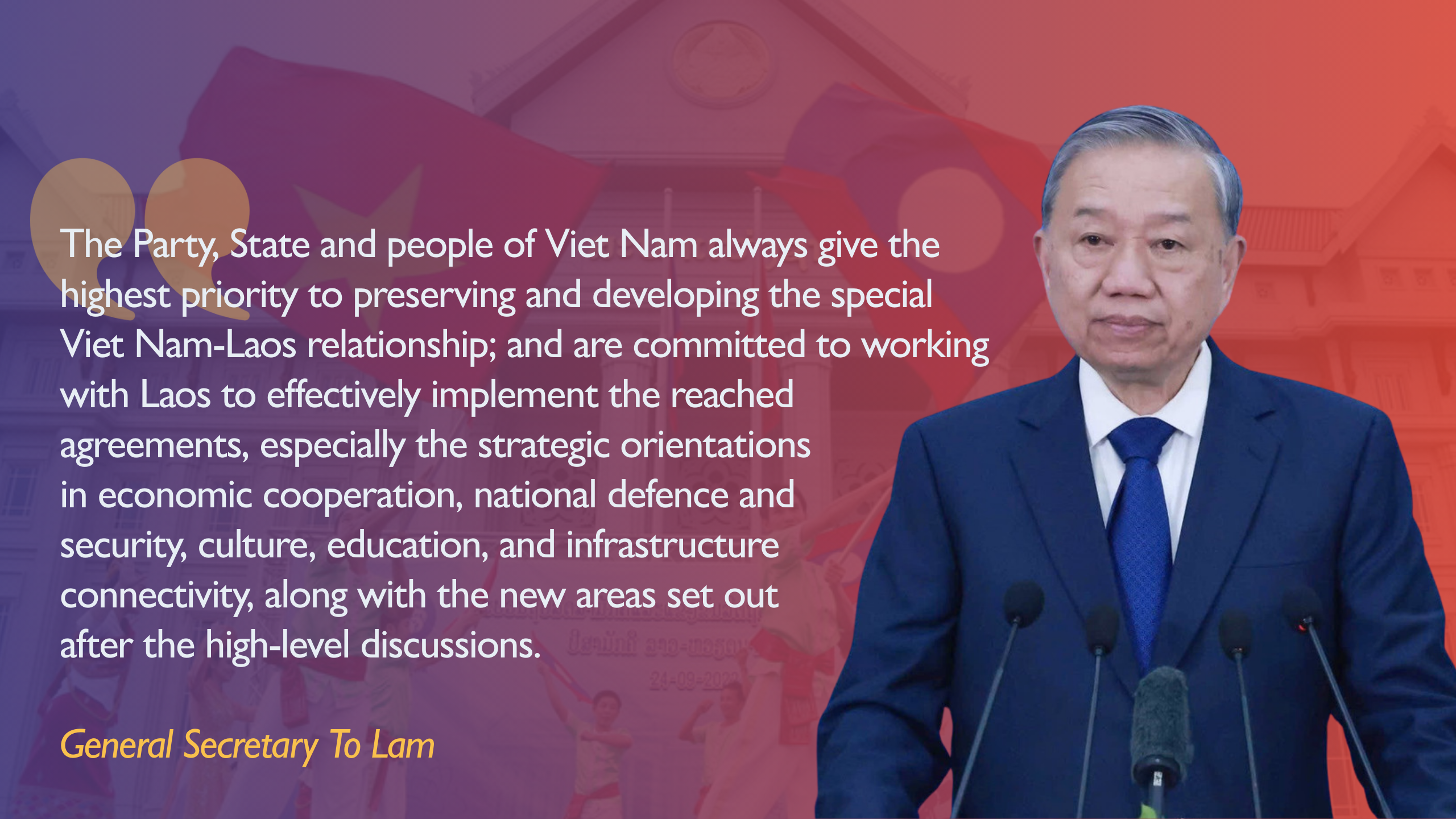 At a meeting with Lao Prime Minister Sonexay Siphandone, Vietnamese Party General Secretary To Lam asked the two PMs to continue directing the two sides' agencies to ensure close coordination and active implementation of the high-level commitments and agreements.