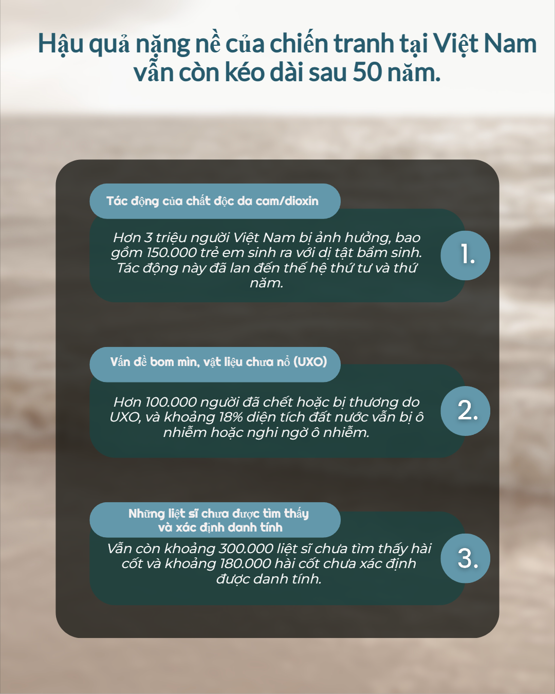 Hiện nay, 50 năm sau khi cuộc chiến kết thúc, chúng ta vẫn đang phải đối mặt với 3 hậu quả rất lớn: Thứ nhất, tác động của chất độc da cam/dioxin trên con người và môi trường. Hơn 3 triệu người Việt Nam bị ảnh hưởng bởi chất độc da cam/dioxin, trong đó 150.000 trẻ em sinh ra với dị tật bẩm sinh. Tác động của chất độc da cam/dioxin đã kéo sang thế hệ thứ tư, thứ năm của người Việt Nam.Thứ hai, bom mìn vật liệu chưa nổ (UXO) vẫn tiếp tục giết chết và làm bị thương đồng bào ta và gây ô nhiễm môi trường trên một diện tích lớn. Hơn 100.000 người đã bị chết, bị thương do UXO gây ra. Trên dưới 18% tổng diện tích của cả nước vẫn bị ô nhiễm và nghi ngờ ô nhiễm UXO. Thứ ba, bên cạnh những nghĩa trang liệt sĩ trên khắp cả nước, vẫn còn khoảng 300.000 liệt sĩ chưa tìm thấy hài cốt, khoảng 180.000 hài cốt liệt sĩ chưa xác định được danh tính. Việt Nam là nước duy nhất trên thế giới hàng tuần vẫn phát chương trình “Nhắn tìm đồng đội” trên sóng truyền hình quốc gia, công bố danh tính, dữ liệu cá nhân của những cán bộ, chiến sĩ mất tích, để ai biết được thì báo cho các cơ quan chức năng.