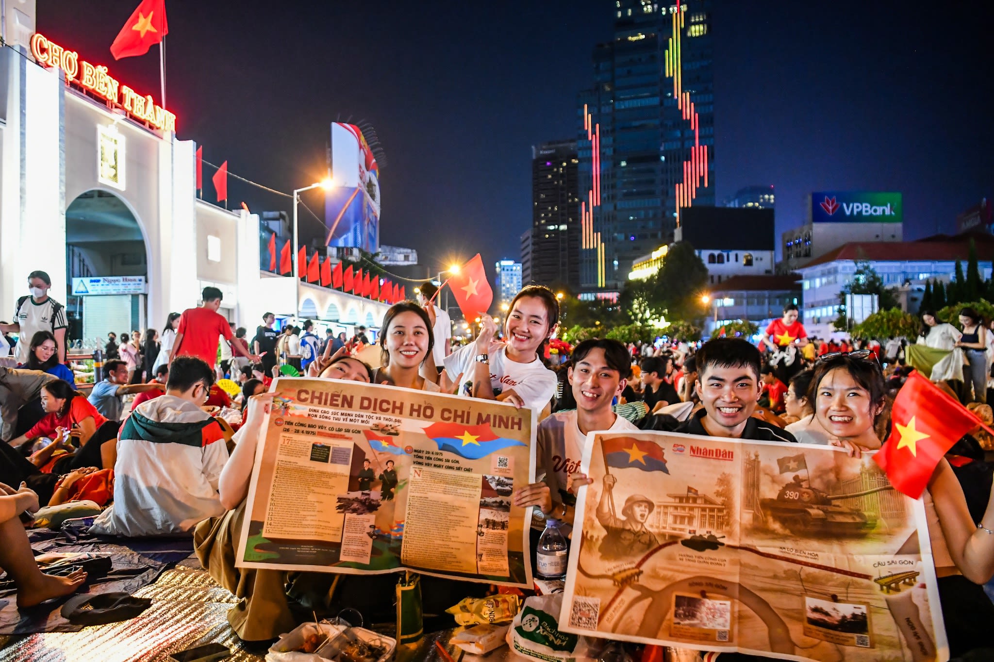 The joy of young people in Ho Chi Minh City as they receive Nhan Dan Newspaper's special supplement in celebration of national reunification.