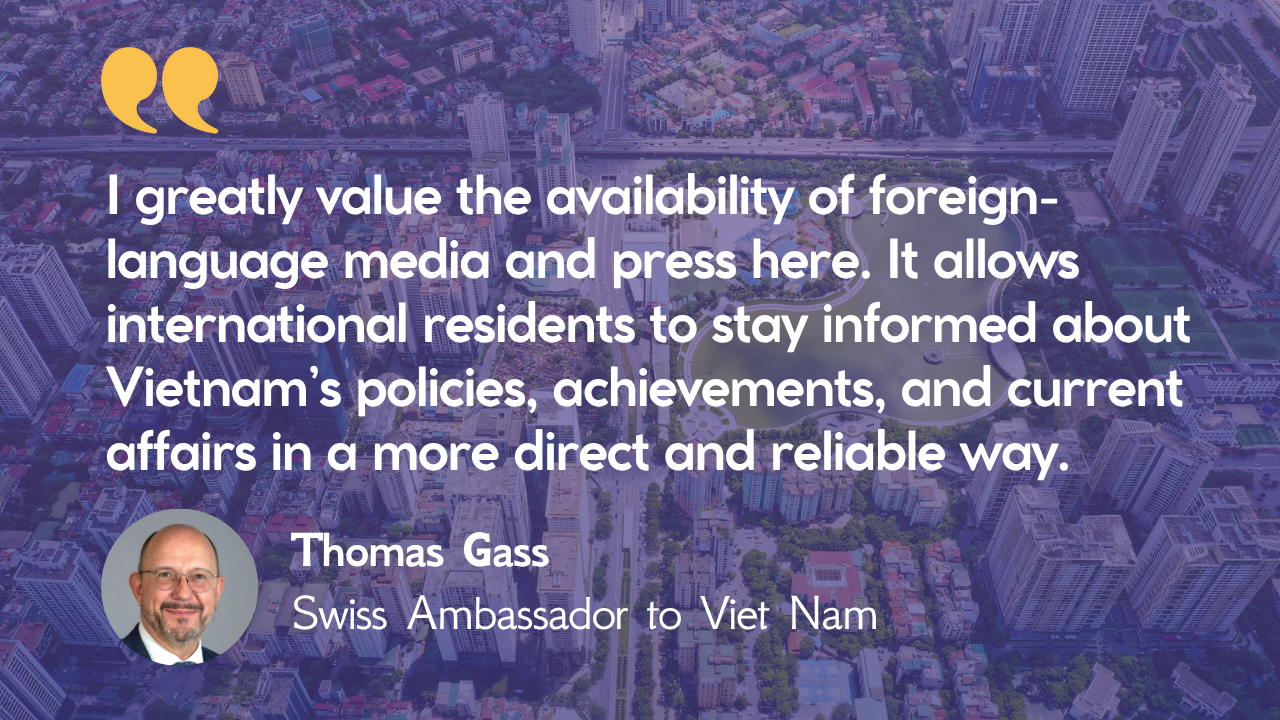 Speaking to Nhan Dan Newspaper, Swiss Ambassador to Viet Nam Thomas Gass noted: “While I regret not being able to read Vietnamese, I greatly value the availability of foreign-language media and press here. It allows international residents like myself to stay informed about Vietnam’s policies, achievements, and current affairs in a more direct and reliable way.”