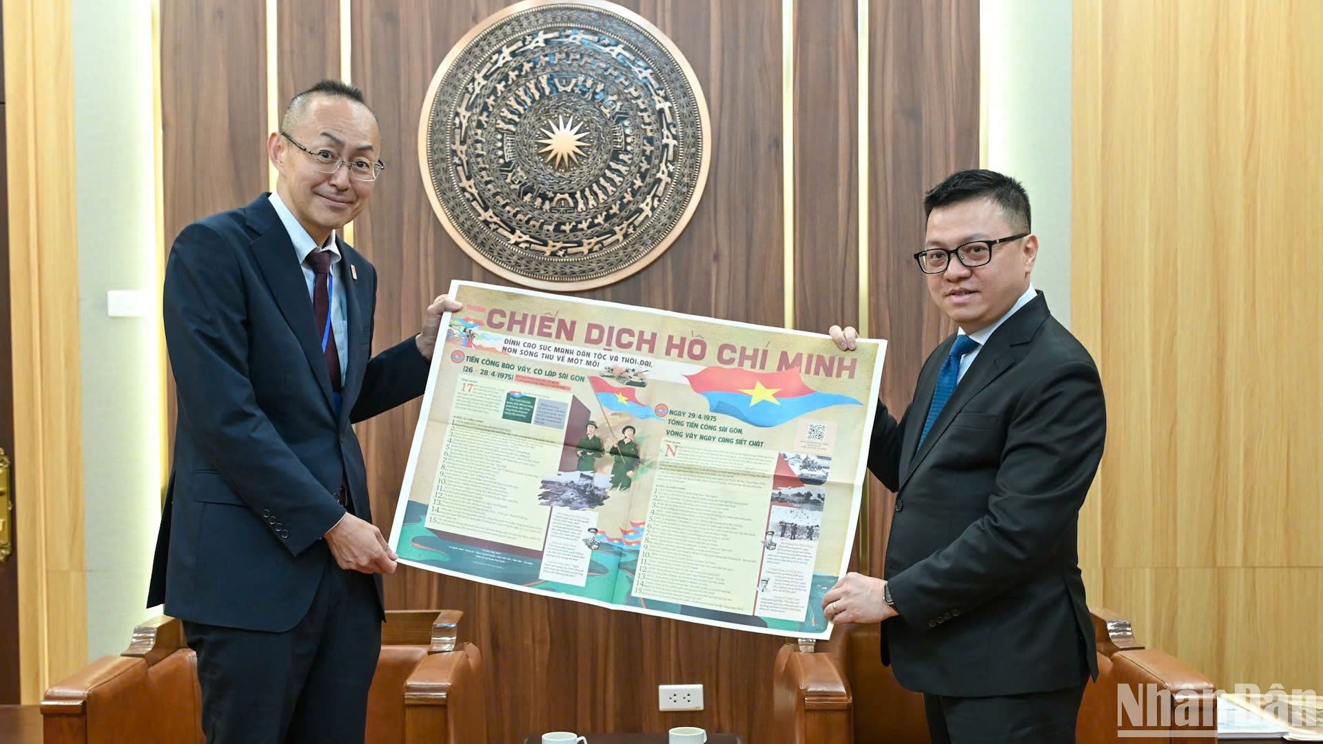 Editor-in-Chief Le Quoc Minh presents Nhan Dan Newspaper’s special supplement commemorating the 50th anniversary of the Liberation of the South and National Reunification to JICA Viet Nam Chief Representative, Kobayashi Yosuke. (Photo: BUI GIANG/NDO)