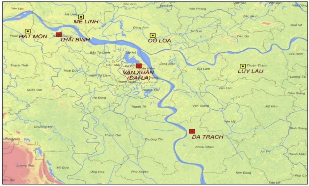 Sơ đồ: Vị trí của thành Cổ Loa, Mê Linh, Vạn Xuân, Ô Diên, Tống Bình, Đại La… và một số dấu tích quan trọng của thời Bắc thuộc trên đôi bờ sông Hồng
