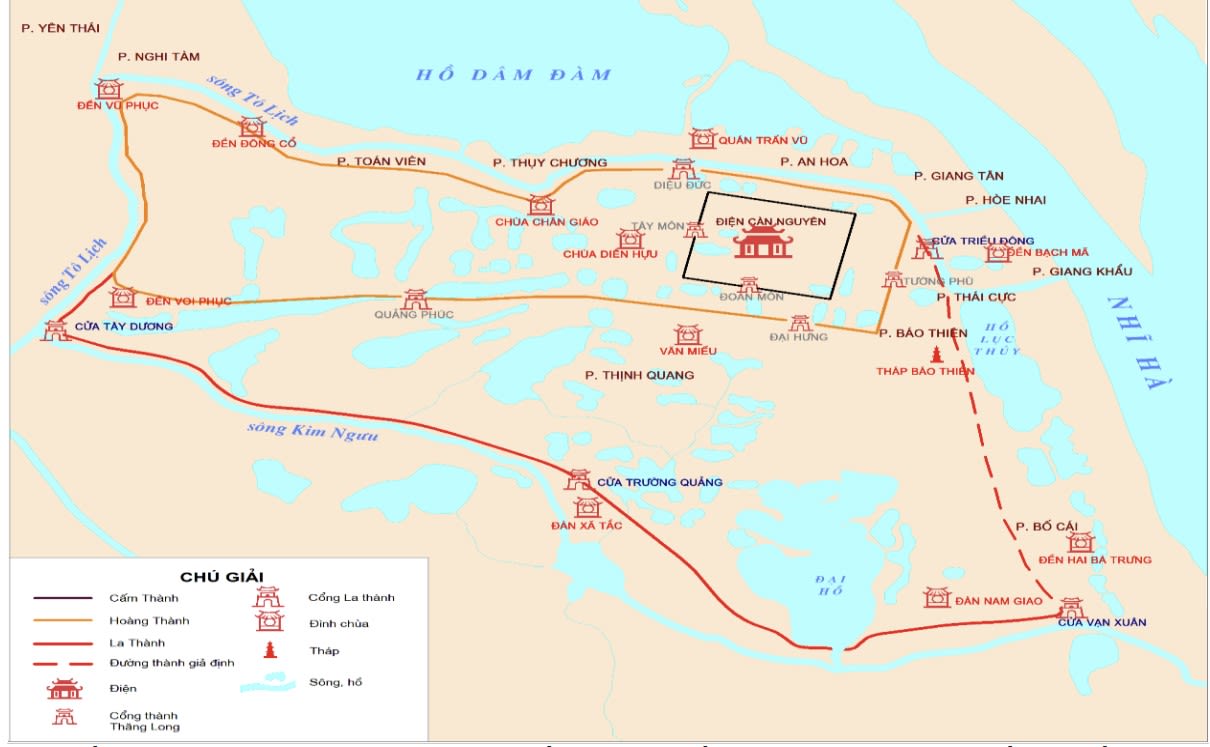 Sơ đồ: Thành Thăng Long thời Lý Trần trong mối quan hệ với sông Hồng, Hồ Tây và các sông Tô Lịch, Kim Ngưu.