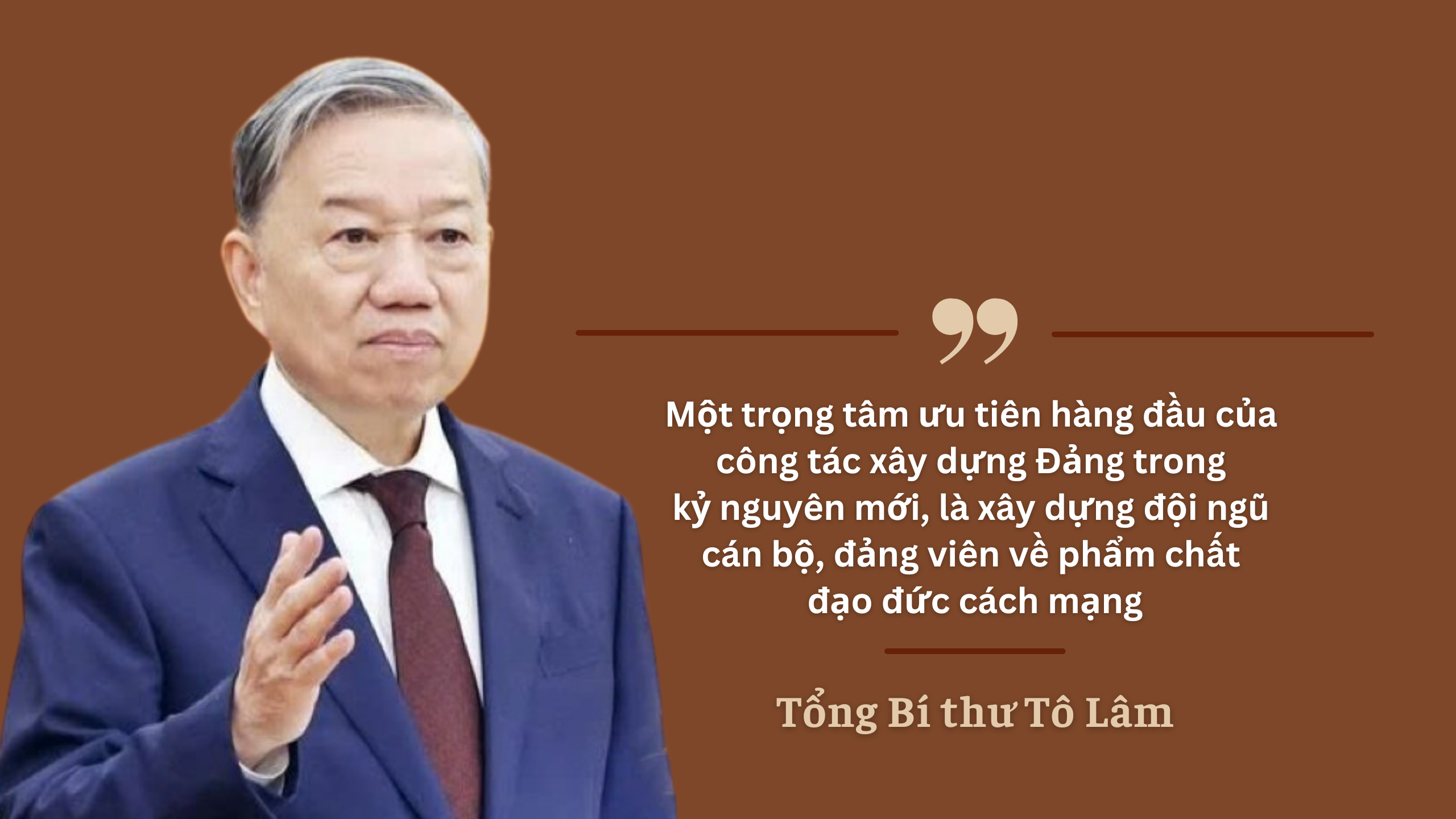 Vì vậy, một trọng tâm ưu tiên hàng đầu của công tác xây dựng Đảng trong kỷ nguyên mới, theo quan điểm của Tổng Bí thư Tô Lâm là xây dựng đội ngũ cán bộ, đảng viên về phẩm chất đạo đức cách mạng. Trên nền tảng của các giá trị đạo đức cần, kiệm, liêm chính, chí công vô tư, Tổng Bí thư nhấn mạnh các phẩm chất cần có của đội ngũ cán bộ Đảng trong kỷ nguyên mới là: “(i) Có bản lĩnh chính trị vững vàng, phẩm chất đạo đức trong sáng, dám nghĩ, dám làm, dám chịu trách nhiệm, dám đổi mới sáng tạo, dám đột phá vì lợi ích chung; hết lòng, hết sức phụng sự Tổ quốc, phục vụ nhân dân, luôn đặt lợi ích quốc gia, dân tộc, lợi ích của Nhân dân lên trên hết, trước hết. (ii) Có bản lĩnh, quyết tâm cao, sẵn sàng dấn thân, hy sinh lợi ích cá nhân. Dám đi đầu, đổi mới, loại bỏ cái cũ, cái lạc hậu; khơi thông điểm nghẽn, giải quyết vướng mắc, ách tắc trong thực tiễn, mang lại hiệu quả cao trong thực hiện chức trách, nhiệm vụ; giải quyết những vấn đề sai sót tồn đọng, kéo dài hoặc đột phá đối với những vấn đề mới chưa có quy định hoặc quy định chồng chéo, thiếu thống nhất, khó thực hiện. (iii) Có năng lực cụ thể, tổ chức thực hiện, đưa chủ trương chiến lược của Đảng vào thực tiễn từng bộ, ban, ngành, địa phương (chuyển đổi số, chuyển đổi xanh, phát triển hạ tầng chiến lược, cải cách triệt để thủ tục hành chính…)” [19]
