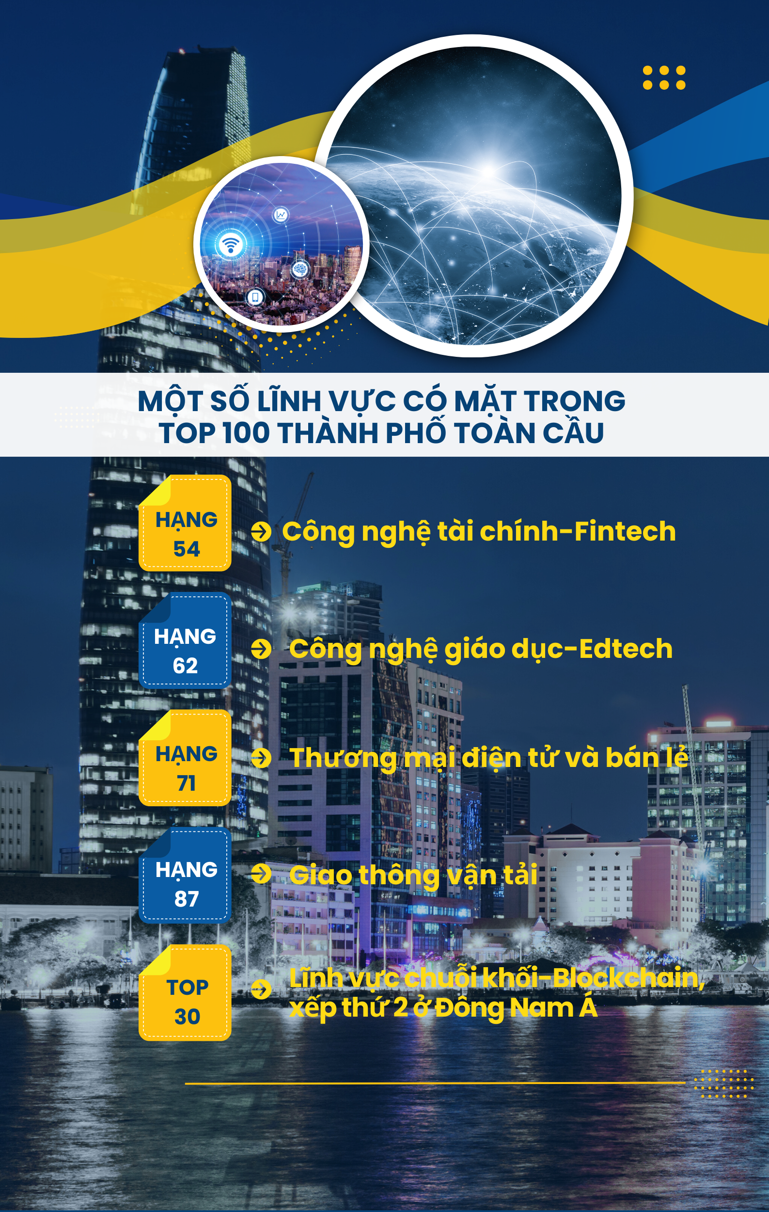 Đây là năm thứ tư liên tiếp Thành phố Hồ Chí Minh thăng hạng trong bảng xếp hạng toàn cầu. Một thành tựu đáng tự hào, phản ánh đúng vị thế đầu tàu kinh tế và trung tâm đổi mới sáng tạo của cả nước. Trong đó, một số lĩnh vực có mặt trong top 100 thành phố toàn cầu như công nghệ tài chính-Fintech (thứ 54), công nghệ giáo dục-Edtech (thứ 62), thương mại điện tử và bán lẻ (thứ 71), giao thông vận tải (thứ 87), lĩnh vực chuỗi khối (Blockchain) Top 30 toàn cầu, xếp thứ 2 ở Đông Nam Á.