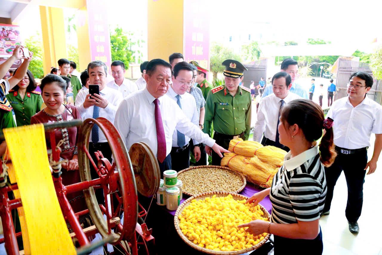 Đồng chí Nguyễn Trọng Nghĩa, Ủy viên Bộ Chính trị, Trưởng Ban Tuyên giáo và Dân vận Trung ương và các đại biểu tham quan các gian hàng làng nghề truyền thống của xã Đô Lương trong khuôn khổ Ngày hội Toàn dân bảo vệ an ninh Tổ quốc xã Đô Lương, ngày 16/7/2025