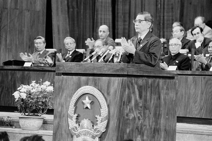 Phát biểu tại Đại hội VI sau khi được bầu làm Tổng Bí thư của Đảng, đồng chí Nguyễn Văn Linh nhấn mạnh Đại hội lần này đã đánh dấu bước chuyển quan trọng trong quá trình kế thừa và đổi mới sự lãnh đạo của Đảng. Ảnh: TTXVN