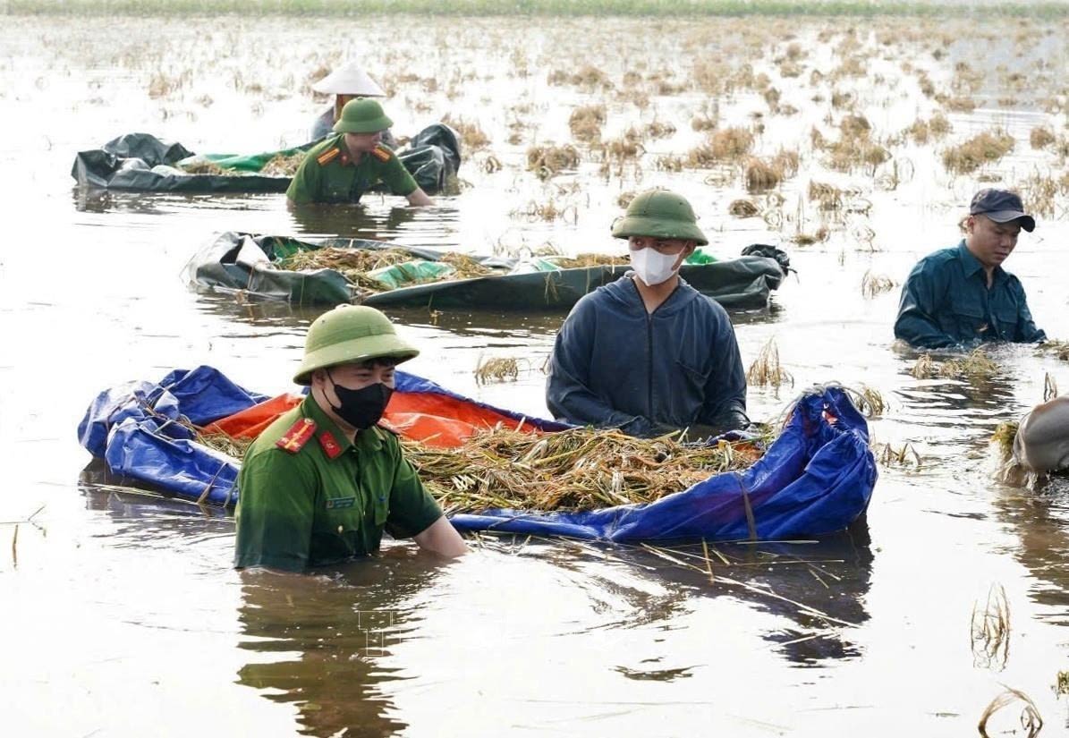 Công an giúp người dân huyện Thường Tín (Hà Nội) gặt lúa (tháng 9/2024). Ảnh: TTXVN