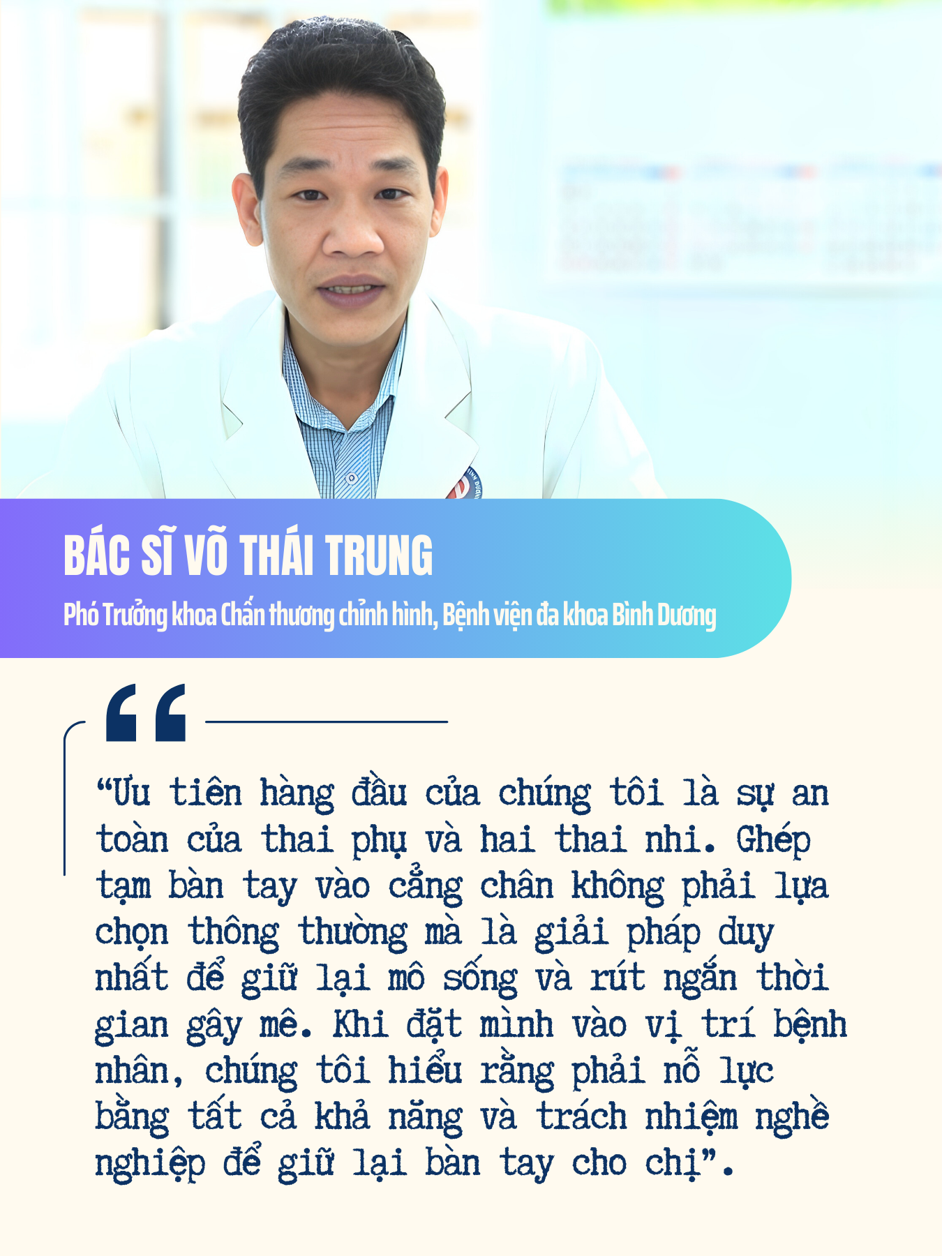 Tháng 9/2025, Bệnh viện đa khoa Bình Dương tiếp nhận trường hợp thai phụ P đang mang song thai 23 tuần, trong tình trạng sốc chấn thương nặng. Tai nạn lao động khiến 1/3 dưới cẳng tay phải bị dập nát, bàn tay đứt lìa hoàn toàn. Đây là một trong những tình huống y khoa phức tạp nhất, khi bác sĩ phải cùng lúc bảo vệ cả ba sinh mạng–người mẹ và hai thai nhi.