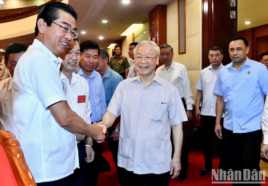 Cố Tổng Bí thư Nguyễn Phú Trọng và các đại biểu dự Hội nghị sơ kết 1 năm hoạt động của Ban Chỉ đạo phòng, chống tham nhũng, tiêu cực tỉnh, thành phố trực thuộc Trung ương (19/6/2023). (Ảnh: Đăng Khoa)